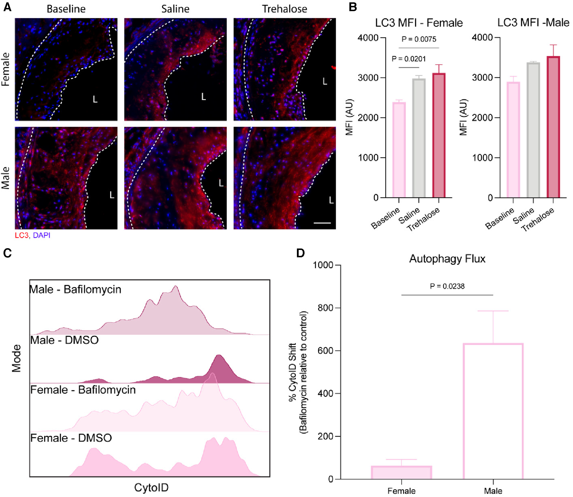 Autophagy is differentially regulated between female and male mice. (A) Representative immunofluorescence of the aortic root stained with the autophagosome marker LC3 (red) and nucleus (blue). Scale bar = 50 µm. (B) Quantification of the mean fluorescence intensity (MFI) of the autophagosome marker LC3 within the total plaque area (n = 6 males and females). (C) Representative histogram of CytoID fluorescence intensity (n = 3 males and females). (D) Fold change of the CytoID MFI to Bafilomycin (n = 3 males and females). Statistical significance was assessed with an unpaired t-test when comparing two groups or one-way ANOVA with Holm-Sidak's post hoc test for multiple comparisons correction when comparing more than two groups.