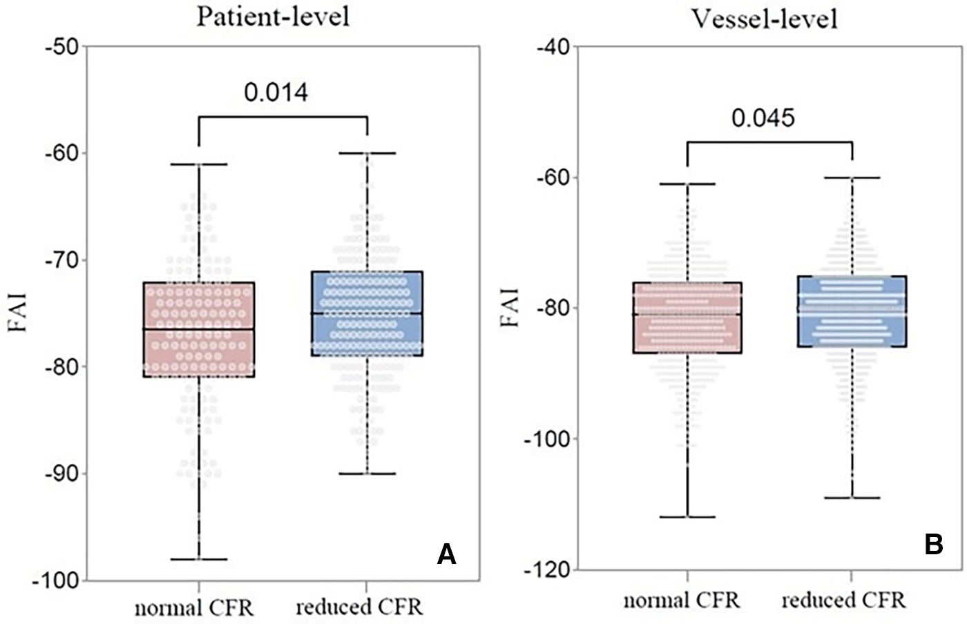 Comparison of the FAI between normal CFR group and reduced CFR group. (A) Comparison at the patient level; (B) Comparison at the vessel level. FAI, fat attenuation index; CFR, coronary flow reserve; CAD, coronary artery disease.