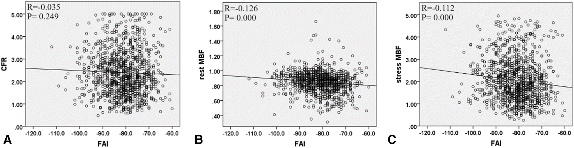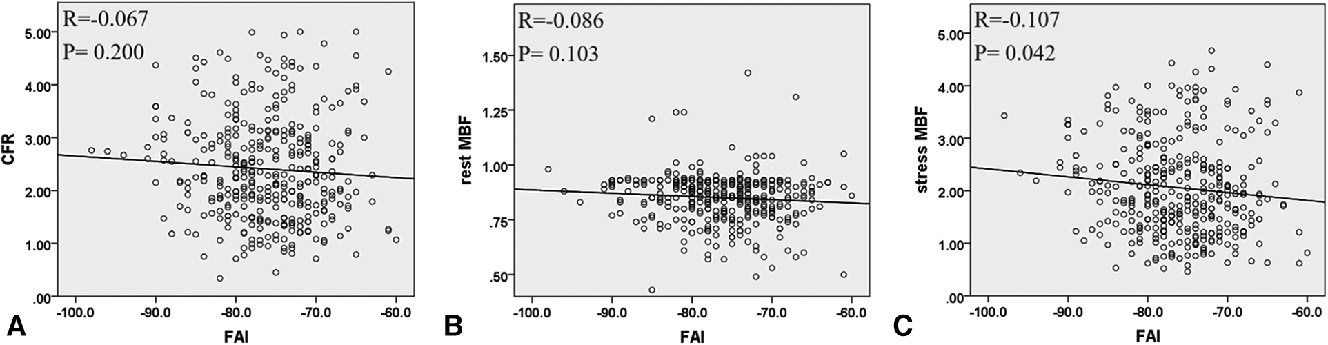 The correlation between FAI with CFR, rest MBF, and stress MBF at the patient level. (A) FAI and CFR, (B) FAI and rest MBF, and (C) FAI and stress MBF. FAI, fat attenuation index; CFR, coronary flow reserve; MBF, myocardial blood flow.