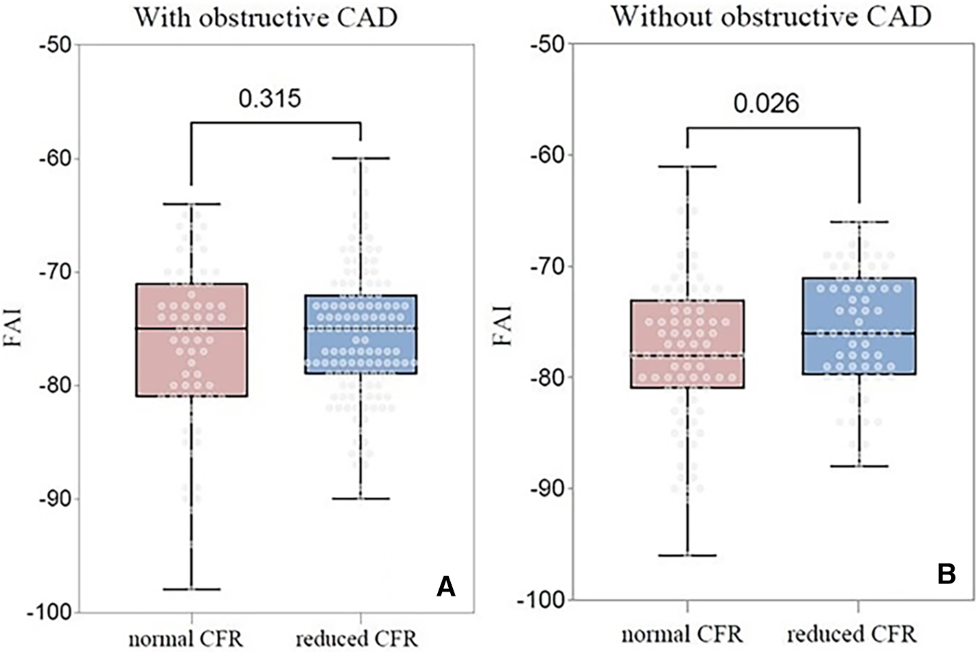 In patients with obstructive CAD, no significant difference was observed between the FAI of the patients with a normal and reduced CFR (−76.4 HU vs. −75.4 HU; P = 0.315) (Figure 4A). Conversely, in patients without obstructive CAD, FAI was significantly higher in patients with reduced CFR (−75.5 HU vs. −77.7 HU; P = 0.026) than in those with normal CFR (Figure 4B). However, no significant difference was observed between the global CFR of patients with high and low FAI among patients with or without obstructive CAD.