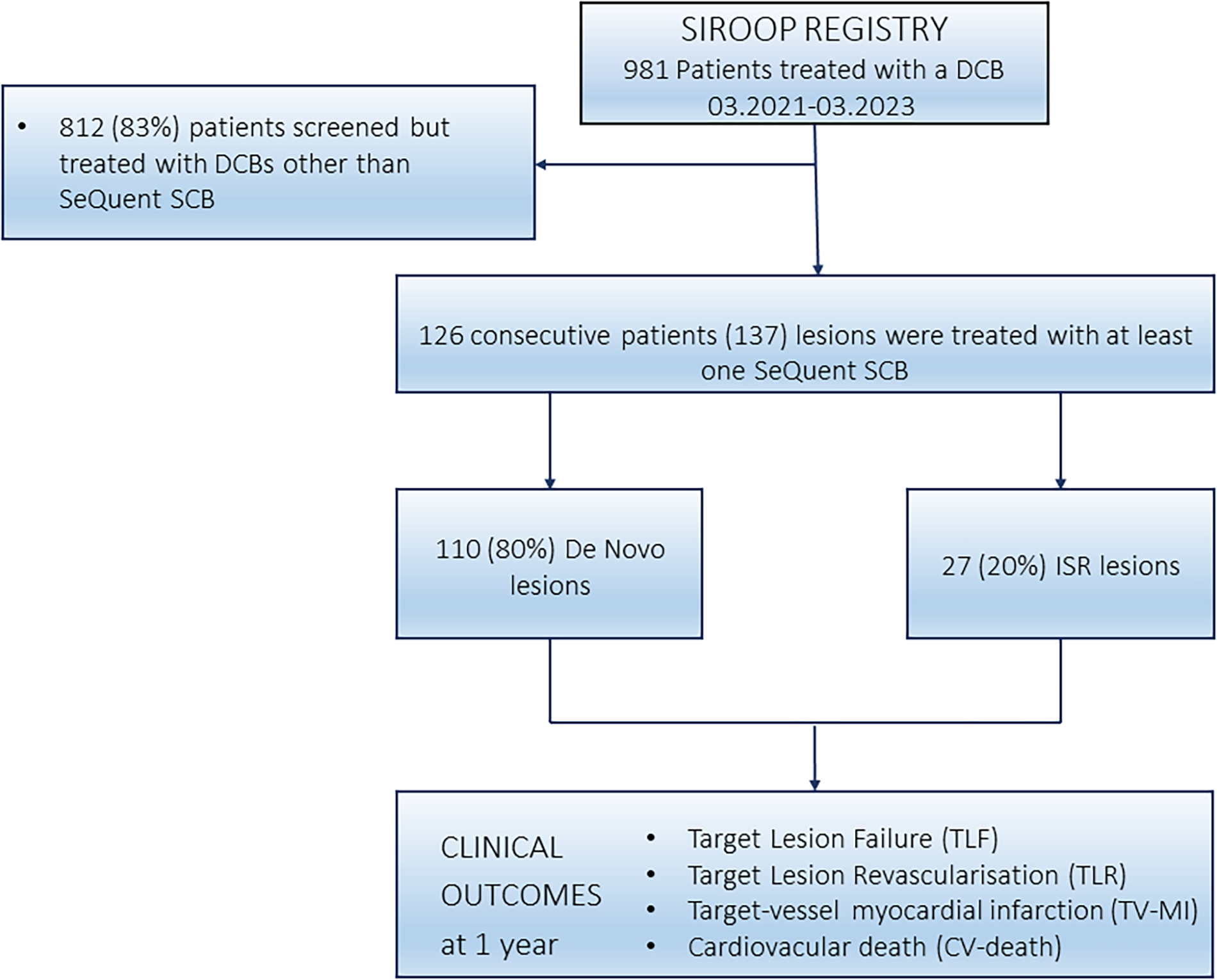 We analyzed consecutive patients from the prospective SIROOP Registry (Prospective Registry Study to Evaluate the Outcomes of Coronary Artery Disease Patients Treated With SIROlimus Or Paclitaxel Eluting Balloon Catheters) (ClinicalTrials.gov identifier: NCT04988685), which was designed to assess the management and outcomes of patients with acute (ACS) and chronic coronary syndrome (CCS) undergoing percutaneous coronary interventions (PCI) with contemporary DCBs. For this study, we analyzed patients who have been treated with the SeQuent® SCB at the Heart Center of the Lucerne Cantonal Hospital (Lucerne, Switzerland), the tertiary cardiology facility for the central part of Switzerland. Figure 1 depicts the study flow chart.