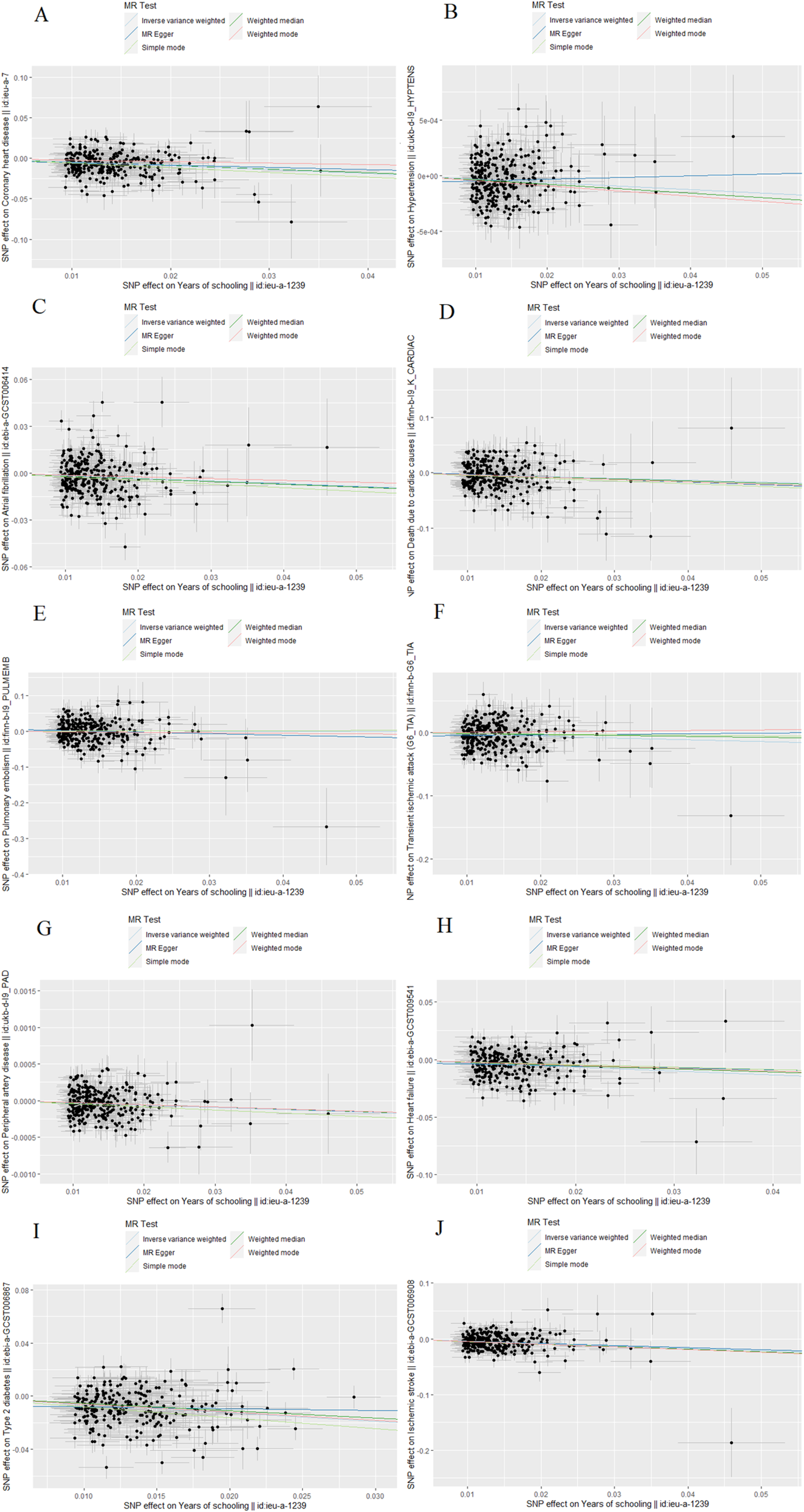 The scatter plot of Mendelian randomization analyses. (A) Coronary heart disease; (B) Hypertension; (C) Atrial fibrillation; (D) Death due to cardiac causes; (E) Pulmonary embolism; (F) Transient ischemic attack; (G) Peripheral artery disease; (H) Heart failure; (I) Type 2 diabetes; (J) Ischemic stroke.
