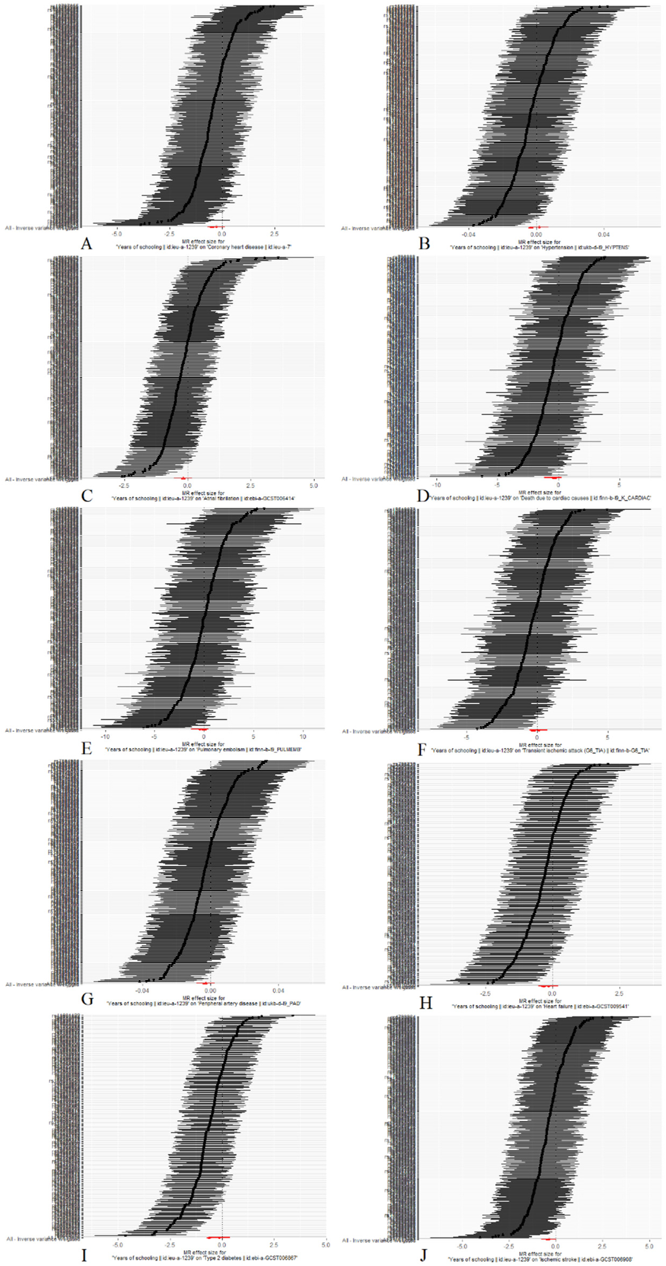 The funnel plot of Mendelian randomization analyses. (A) Coronary heart disease; (B) Hypertension; (C) Atrial fibrillation; (D) Death due to cardiac causes; (E) Pulmonary embolism; (F) Transient ischemic attack; (G) Peripheral artery disease; (H) Heart failure; (I) Type 2 diabetes; (J) Ischemic stroke.