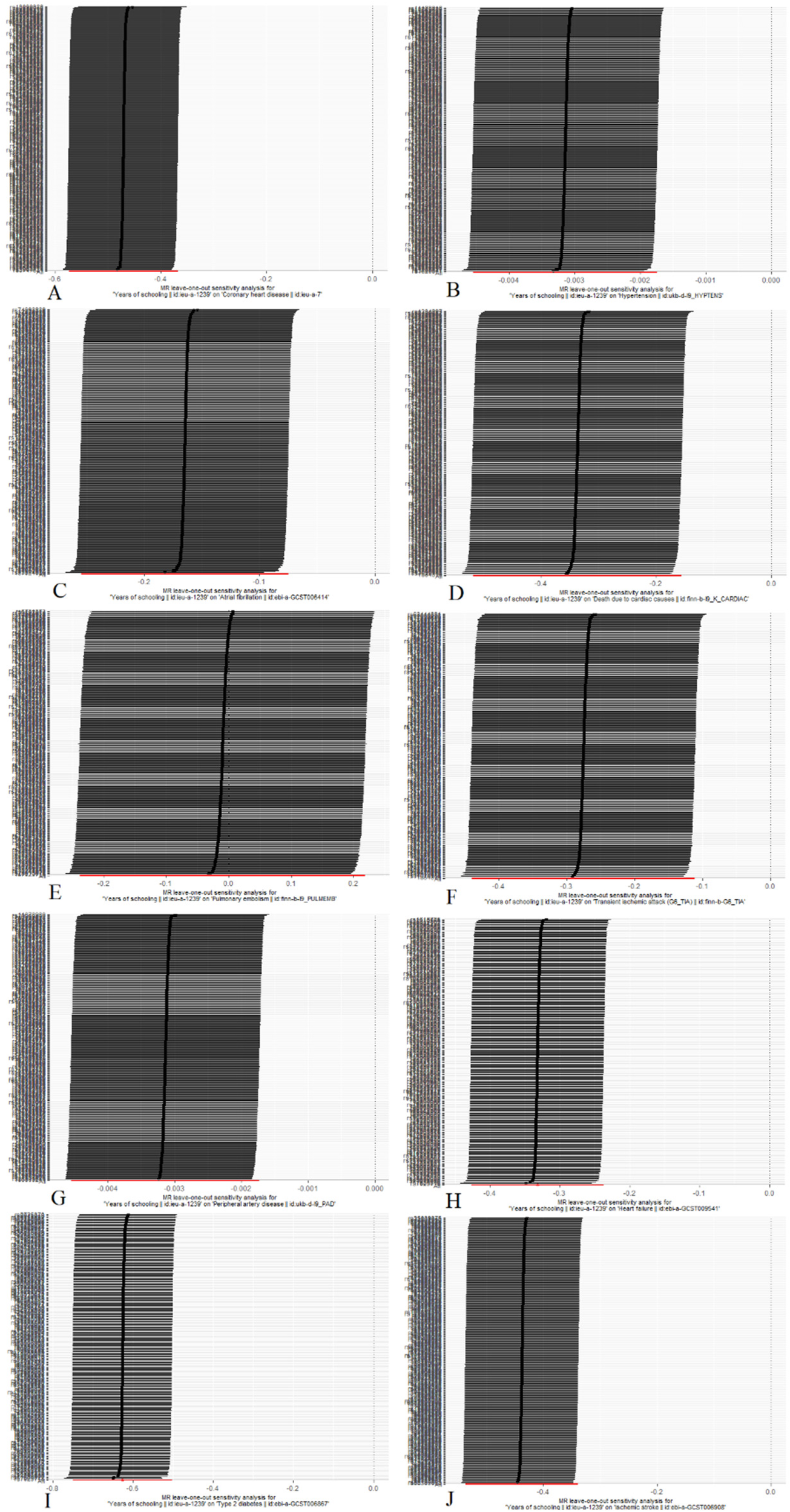 Mendelian randomization leave-one-out analyses. (A) Coronary heart disease; (B) Hypertension; (C) Atrial fibrillation; (D) Death due to cardiac causes; (E) Pulmonary embolism; (F) Transient ischemic attack; (G) Peripheral artery disease; (H) Heart failure; (I) Type 2 diabetes; (J) Ischemic stroke.