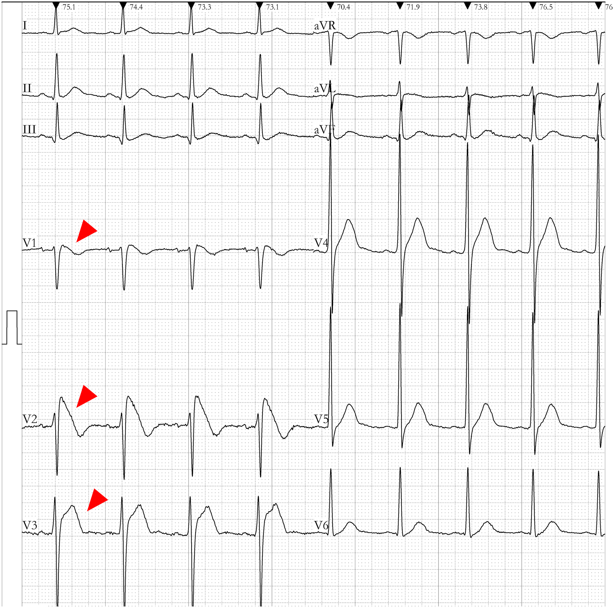 Electrocardiogram (ECG) of the enrolled brugada syndrome (BrS) patient. The ECG of the patient demonstrated ST-segment elevation in the anterior lead (highlighted by the red arrow). The V1āV2 leads presented a downsloping ST-segment elevation, while the V5āV6 leads did not exhibit the typical pattern of a right bundle branch block.