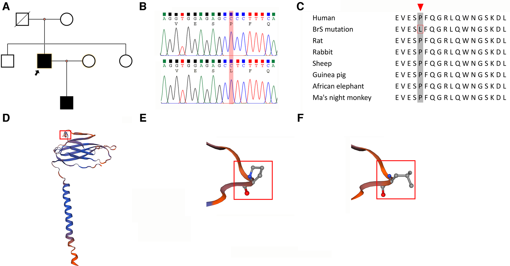 Characterization of the SCN3B P87l mutation. (A) Pedigree of a Family with Brugada syndrome: The pedigree illustrates the inheritance of Brugada syndrome within a family. Squares indicate male members, and circles represent female members. The proband is indicated with a black arrow. Black-filled symbols denote individuals diagnosed with Brugada syndrome, while blank symbols indicate unaffected members. Deceased individuals with unknown electrocardiogram status are marked by a slash. (B) Comparison of Wild-Type and Mutant SCN3B Nucleotide Sequences: The sequence alignment shows a cytosine-to-thymine substitution at nucleotide position 260 in exon 3 of SCN3B (P87l mutation). This mutation leads to a change from proline to leucine at the protein level. (C) Conservation of Proline at Position 87 Across Species: An alignment of SCN3B amino acid sequences from various mammalian species highlights the conservation of the proline residue at position 87, as indicated by a red arrow. (D) Molecular Model of Navβ3: Utilizing the SWISS-MODEL, the molecular structure of Navβ3, which is encoded by the SCN3B gene, has been depicted. It shows a membrane-associated protein with a single transmembrane domain. The proline at position 87 is prominent in the extracellular segment and is marked in red. (E) Hydrophilicity of Proline at Position 87: The proline residue at position 87 in the Navβ3 protein is characterized as hydrophilic. (F) Transition to Hydrophobicity in the Mutant: In the P87l mutant form of SCN3B, the 87th amino acid shifts from the hydrophilic proline to the hydrophobic leucine.