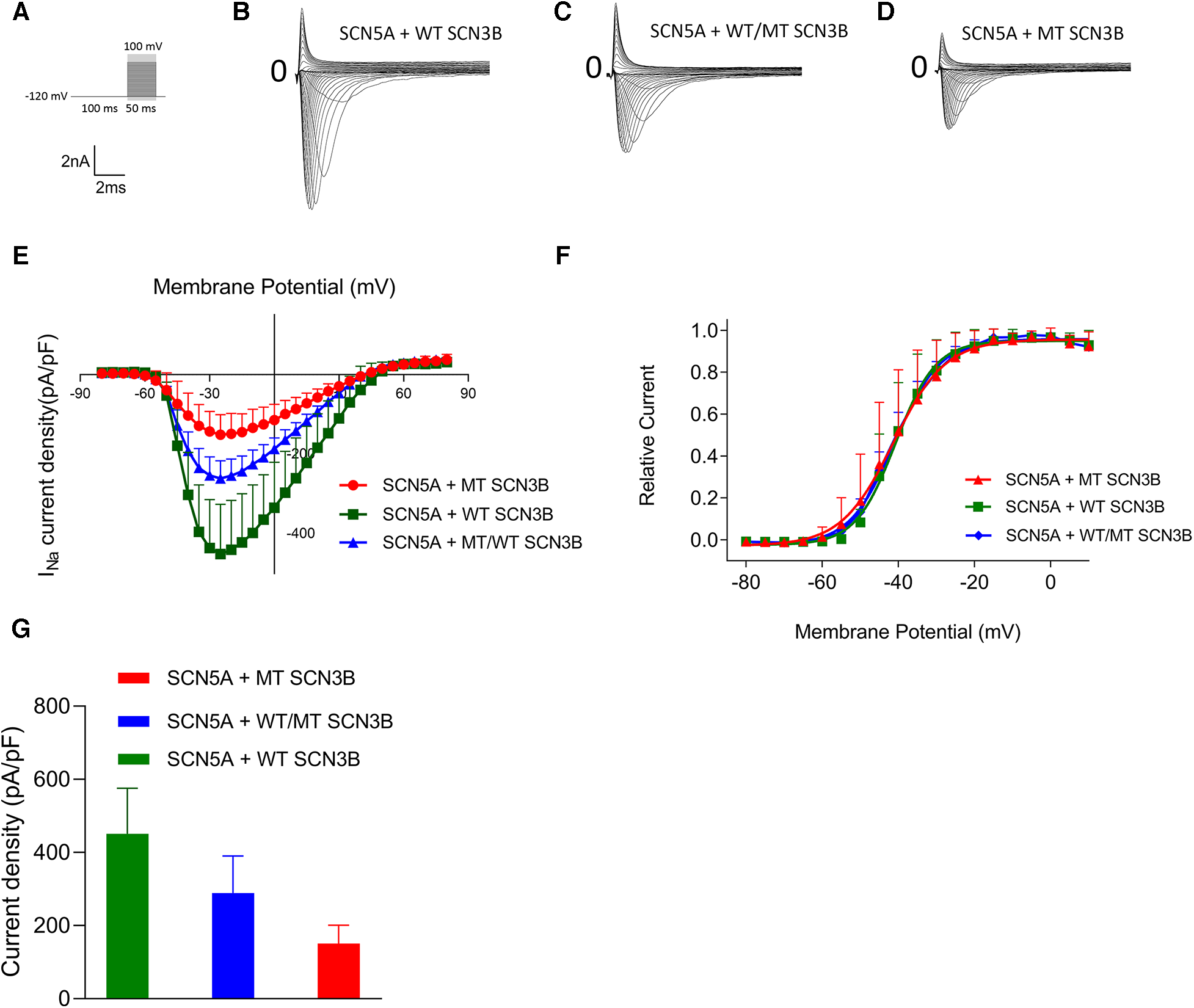 A Scn3b (c.260C>T, p.P87l) mutation was identified in a patient with BrS of Chinese descent. Functional analyses demonstrated that sodium channel activation for the wild type, mutant samples, and co-expression of both commenced at ā55ā mv and peaked at ā25ā mv. The mutant group exhibited a notable reduction, approximately 60%, in peak sodium channel activation current (INa) at ā25ā mv. The parameters for half-maximal activation voltages (V1/2) and slope factors (k) showed no significant differences when comparing wild type, mutant, and combined expression groups (Pā=ā0.98 and Pā=ā0.65, respectively). Additionally, no significant disparities were evident in terms of the steady-state sodium channel inactivation parameters V1/2 and k (with P-values of 0.85 and 0.25, respectively), nor were there significant differences in the activation time constant Ļ (Pā=ā0.59) and late sodium current density (Pā=ā0.23) across the wild-type, mutant, and co-expressed groups. Confocal imaging and Western blot analysis demonstrated decreased plasma membrane localization of SCN3B and SCN5A in the P87l group. Computational simulations of cardiac action potentials suggested that SCN3B P87l can alter the morphology of the action potentials within the endocardium and epicardium while reducing the peak of depolarization.