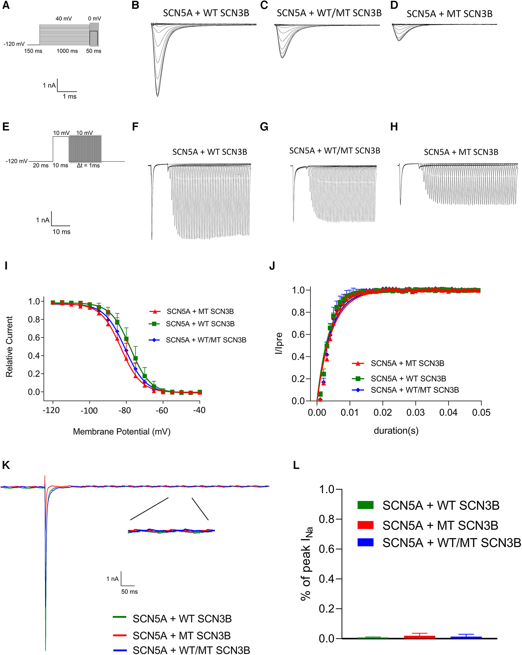 SCN3B P87L's influence on NaV1.5 inactivation, reactivation, and delayed sodium current. (A) Single-channel inactivation protocol is outlined in the upper panel, with the scale bar presented in the lower panel for reference. (BāD) Inactivation current traces for the wild-type group, the mutation group, and the group co-expressing both wild-type and mutation alleles. (E) The recovery stimulation protocol is depicted in the upper panel, with the corresponding scale bar in the lower panel. (FāH) Traces of recovery currents are shown for the wild-type group, the mutation group, and the group co-expressing both wild-type and mutation alleles. (I) The steady-state inactivation curve, modeled with a Boltzmann function, shows no significant difference in half-maximal inactivation voltage (V1/2) or slope factor (k) among the three groups (details provided in TableĀ 2). (J) Recovery kinetics, fitted with an exponential function, reveal no significant differences in the time constant Ļ across the groups (refer to TableĀ 3 for details). (K) Traces of the late sodium current for the wild-type group, the mutation group, and the group co-expressing both wild-type and mutation alleles are shown, including an enlarged view of the late INa current at the bottom. The late sodium currents are virtually identical across groups, with the scale provided below. (L) A bar graph representing the amplitude of the late INa current for each group indicates no significant difference between them (pā=ā0.23).