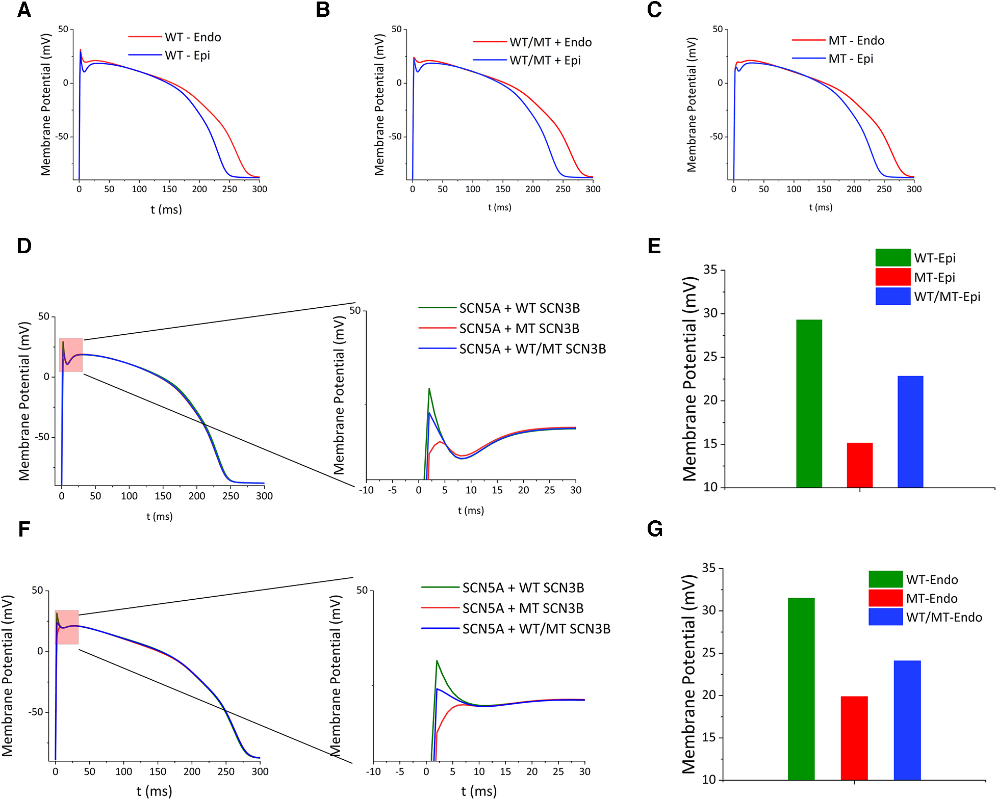 Impact of SCN3B P87l mutation on cardiac action potentials. (AāC) Simulated epicardial action potential waveforms for the wild-type group, the group co-expressing wild-type and mutant alleles, and the mutant group. (D) The left panel illustrates the simulated epicardial action potential waveforms for the wild-type, co-expression, and mutant groups. The right panel presents a zoomed-in view of the critical red segment for enhanced detail. (E) Bar graph showing the peak epicardial depolarization voltages for the wild-type group, the mutant group, and the group co-expressing wild-type and mutant alleles. (F) The left panel depicts simulations of endocardial action potential waveforms for the wild-type group, the group co-expressing wild-type and mutant alleles, and the mutant group. The right panel features a zoomed-in view of the designated red section. (G) Bar graph representing the peak endocardial depolarization voltages for the wild-type group, the mutant group, and the group co-expressing wild-type and mutant alleles.