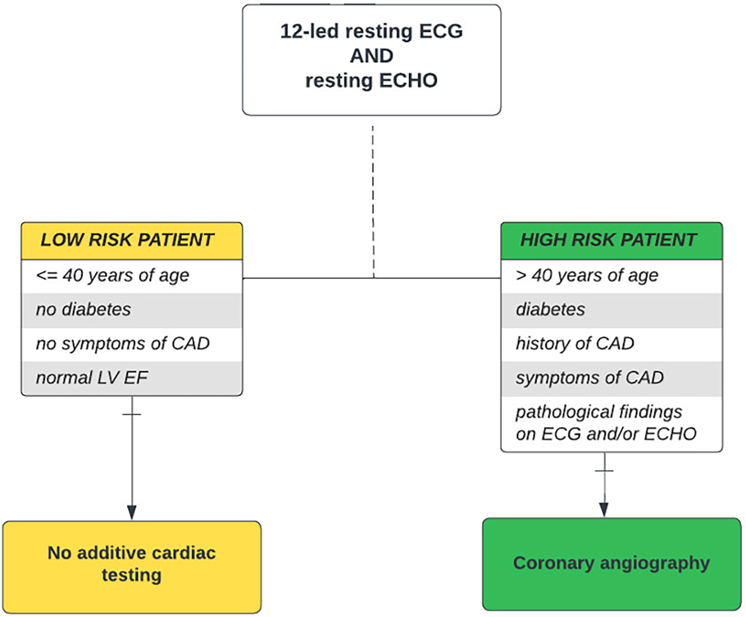 This single-center, observational retrospective cohort study was conducted in adult patients who underwent kidney transplantation at our center between January 2017 and December 2019. Prior to transplantation, all individuals were evaluated using our standardized pretransplant risk-stratified cardiovascular protocol consisting of resting 12-lead electrocardiography (ECG), resting thoracic echocardiography, and coronary angiography. ECG and ECHO were performed in all kidney transplant candidates, while CAG was performed only in high-risk patients. A high-risk patient was defined as a patient with a presence of several risk factors: age over 40 years and/or with a history of diabetes, CVD or cardiovascular symptoms, and/or pathological findings on ECG and ECHO. A low-risk patient was defined as a patient aged 40 years and younger, with the absence of diabetes, with the absence of CVD or its symptoms, and with normal findings on resting ECG and ECHO (Figure 1). The pretransplant cardiovascular disease was recorded in patients with a history of myocardial infarction, heart failure or cardiac revascularization, percutaneous coronary intervention (PCI), and/or coronary artery bypass graft (CABG). A significant obstructive coronary artery disease was defined as stenosis of 50% or more of the left coronary artery (LCA) or 70% or more in at least one epicardial coronary artery or branch vessel detected using CAG (18, 19). Based on the findings, the patients were further indicated to stay on conservative therapy or to undergo myocardial revascularization, CABG, or PCI with (95.8% of patients) or without (4.2% of patients) last-generation drug-eluting stents (DES), according to the cardiological standard of care.