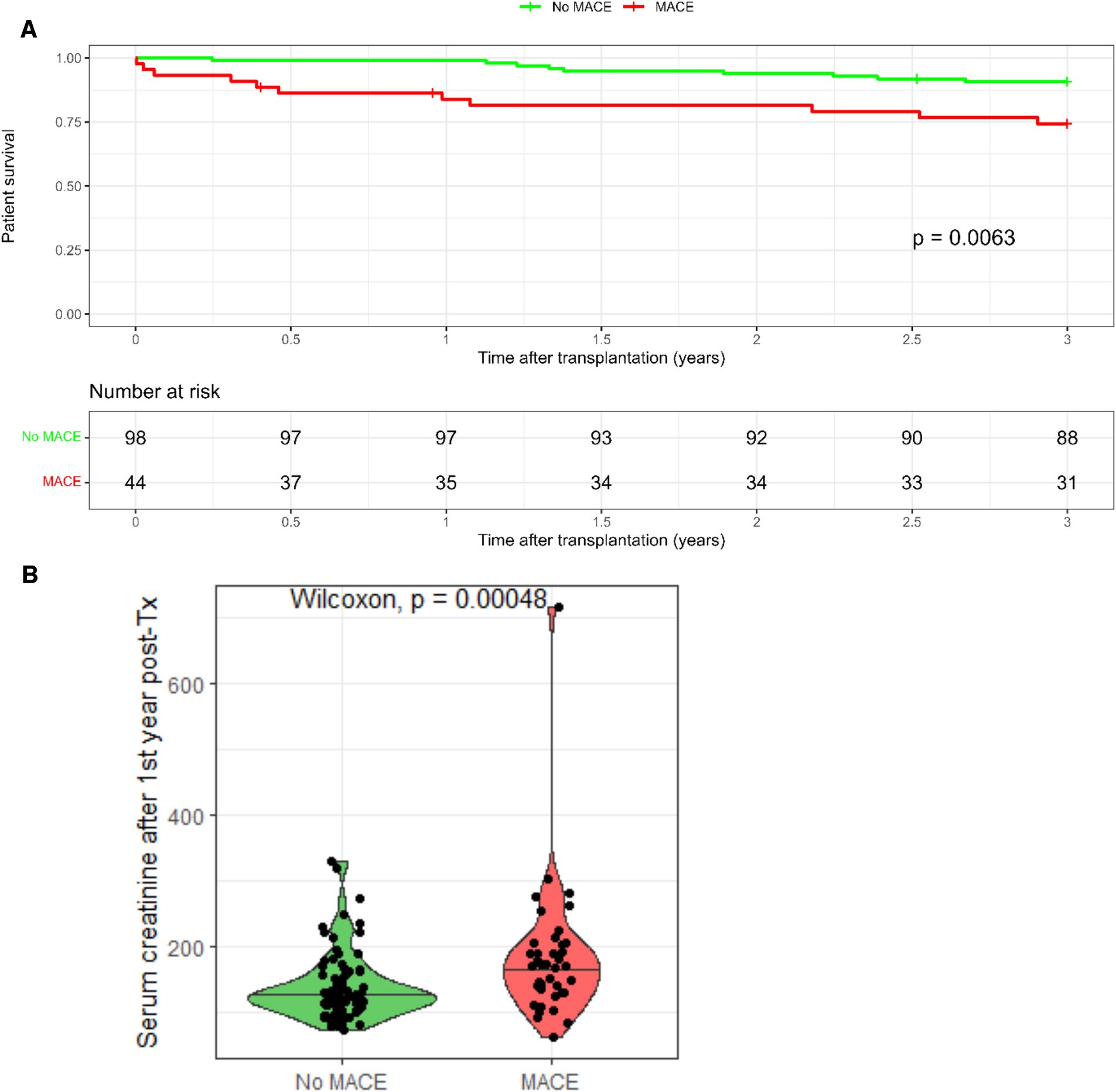 Outcomes of kidney transplant recipients with post-transplant MACE. (A) Kidney transplant recipients without MACE had significantly better survival compared to kidney transplant recipients experiencing MACE. (B) Kidney transplant recipients with MACE had significantly worse graft survival at 1st year post-transplant.