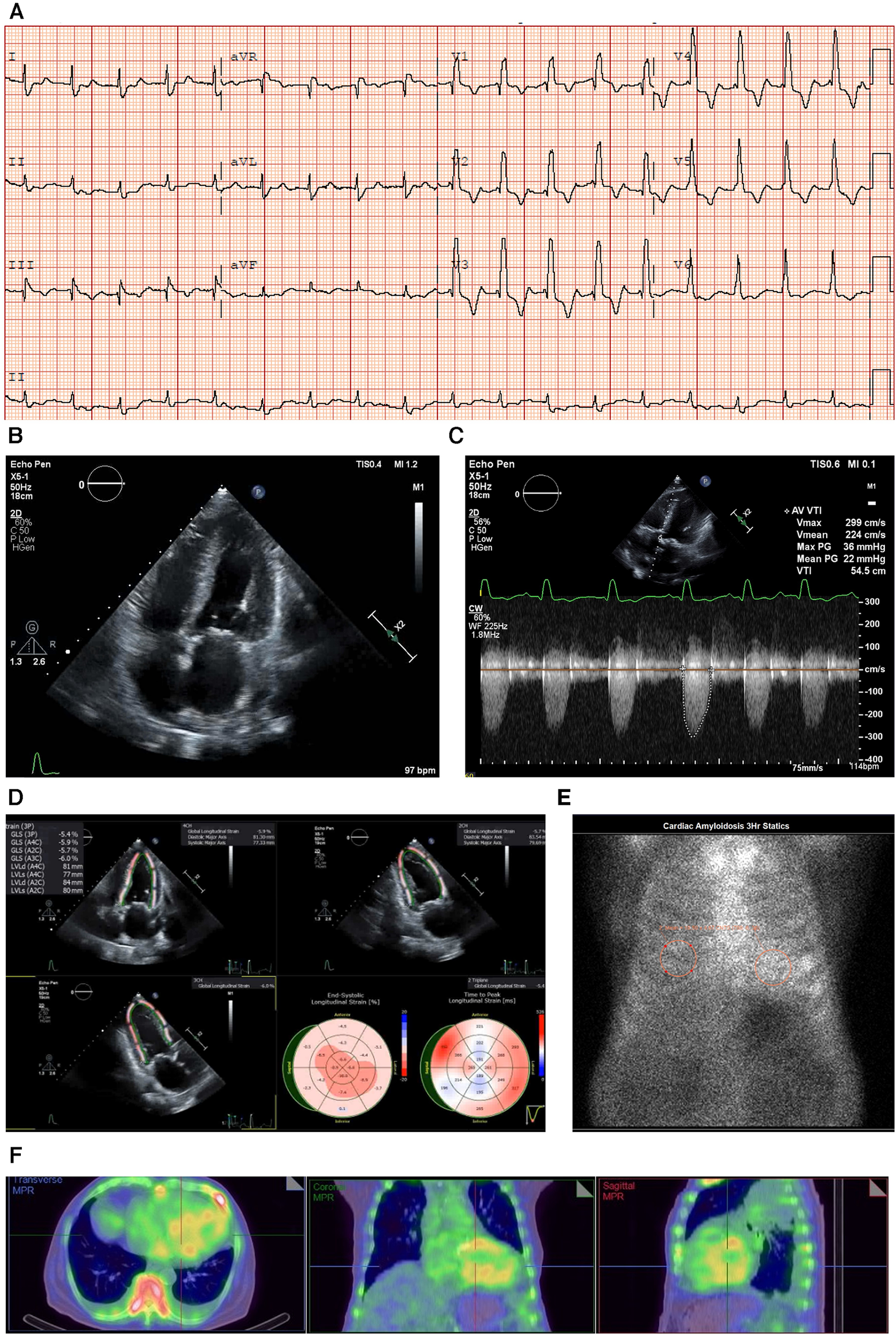 Case 1 clinical investigations. (A) An ECG showing sinus rhythm with first-degree heart block and RBBB morphology, and corrected QT interval prolonged for a heart rate of 98 bpm. (B) A 2D echocardiography with a four-chamber view showing LV hypertrophy with biatrial dilatation. (C) Continuous-wave Doppler of the AV consistent with low-flow/low-gradient AS. The calculated AV area was 0.47 cm2. (D) An echocardiography GLS showing markedly reduced GLS with apical sparing, typical of a diagnosis of CA. (E) A planar bone scintigraphy (99mTc-PYP) scan at 3 h with a H/CL ratio of 1.33. (F) SPECT-CT fusion showing an intense myocardial uptake with a clear LV cavity, excluding the presence of a blood pool.
