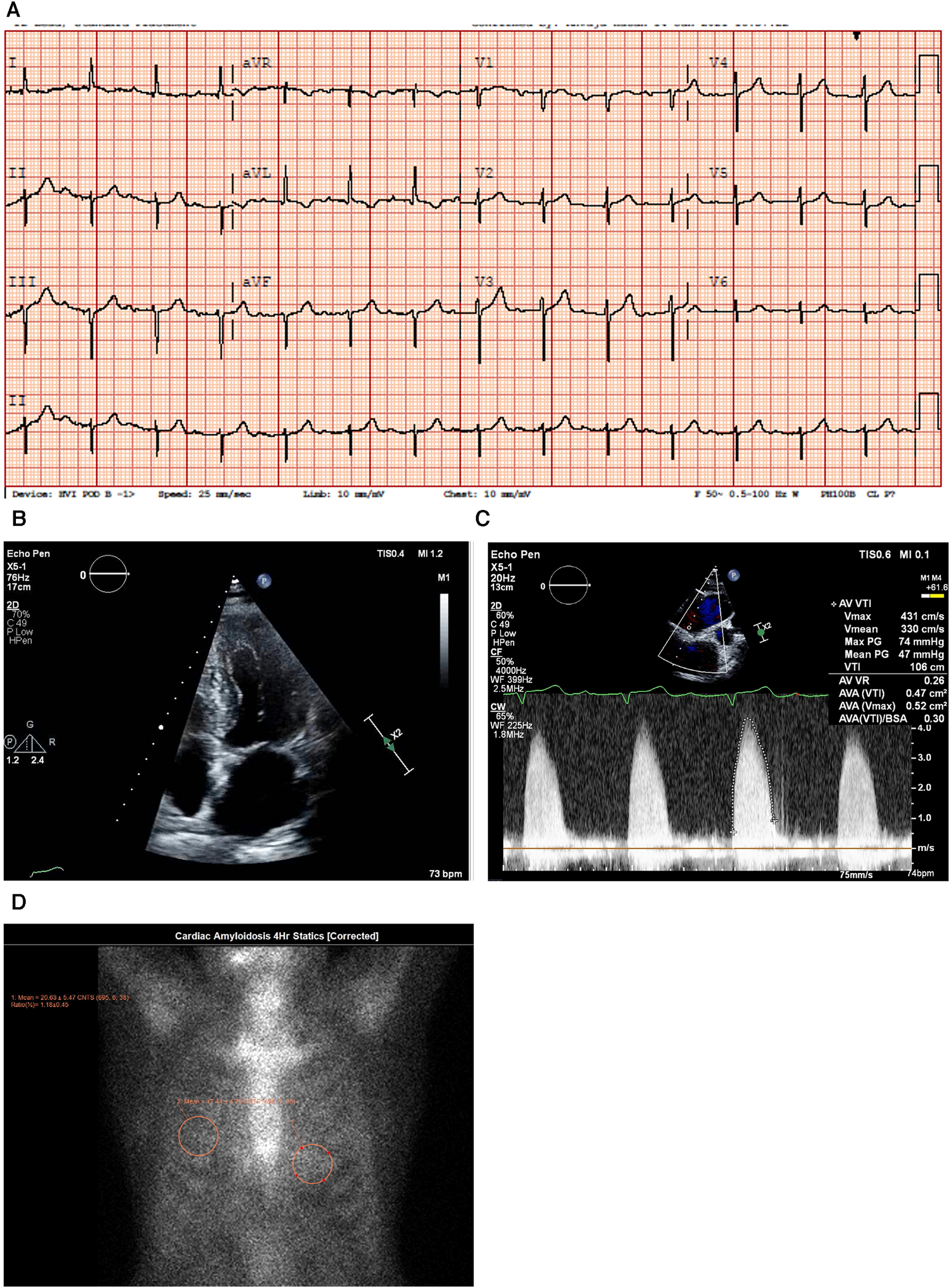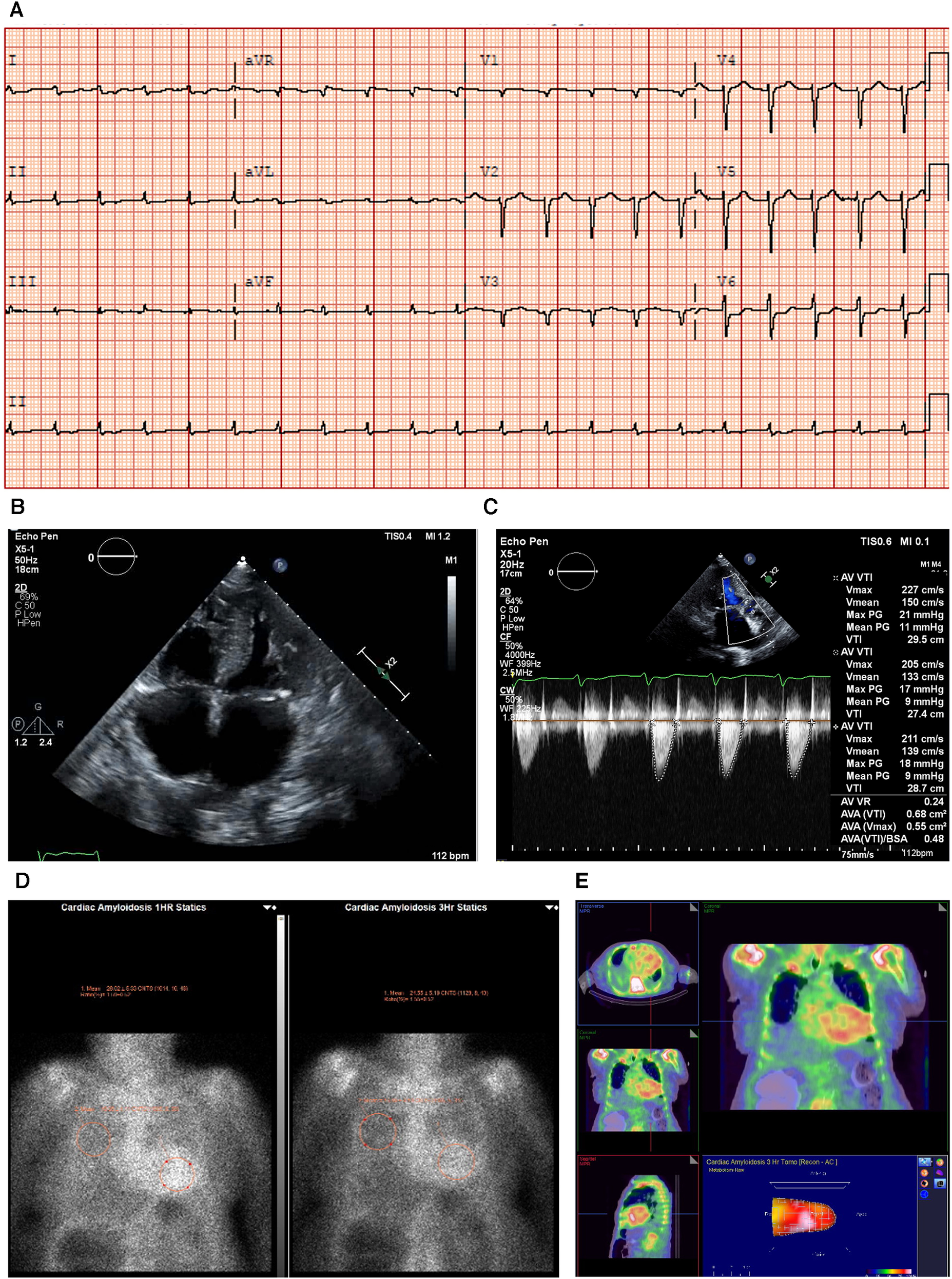 Case 2 clinical investigations. (A) An ECG showing sinus rhythm, low-voltage limb leads, poor R-wave progression, and a pseudo-infarct pattern. (B) A 2D echocardiography with a four-chamber view showing marked concentric LV hypertrophy and biatrial enlargement. (C) Continuous-wave Doppler of the AV is consistent with paradoxical low-flow/low-gradient. The calculated AV area index was 0.45 cm2/m. (D) Planar bone scintigraphy (99mTc-PYP) scan at 1 h and 3 h showing grade 3 myocardial uptake. (E) A SPECT scan demonstrating a strongly positive uptake (grade 3) with clear-cut differentiation between the LV cavity and myocardial uptake.