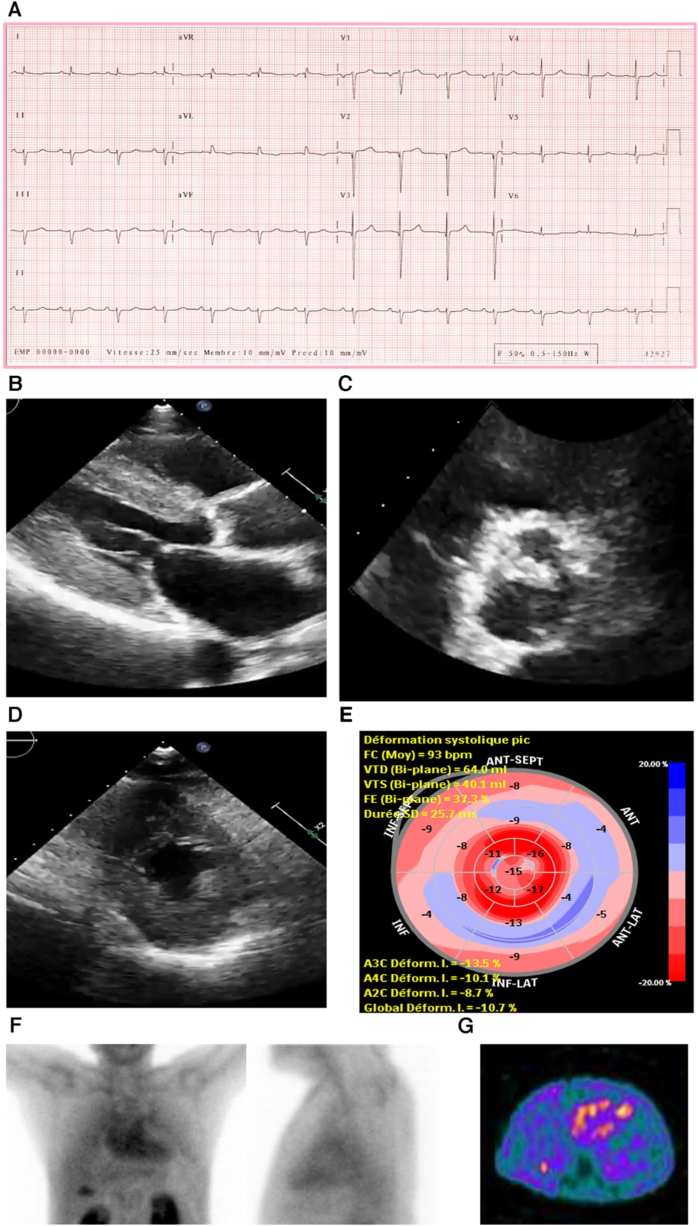 An ECG showed sinus rhythm, low-voltage limb leads (E), poor R wave progression, and a pseudo-infarct pattern. As is to be expected in a patient with CA, the typical ECG pattern revealed discordance between low ECG voltage and LV hypertrophy on the ECHO (Figure 2A) (33).