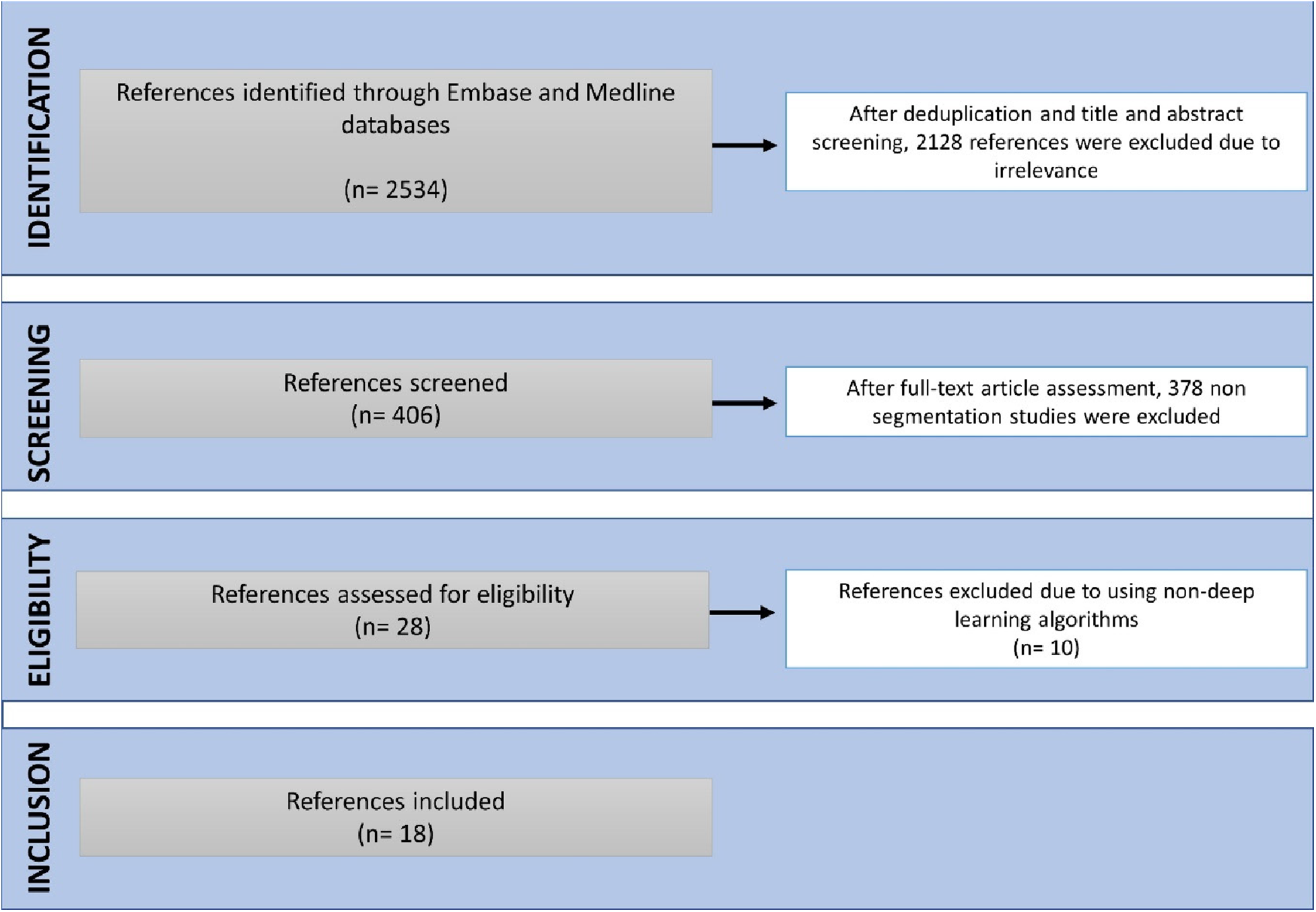 Embase and Medline databases were searched from January 1, 2013 to December 4, 2023. The search strategy was developed around the key themes of the review: “AI”, “CT” and “cardiac”. The full search strategy is provided in Supplementary Table S1. Original research studies published after 1 January 2013 were eligible for inclusion if they (1) presented supervised DL-based tools (2) for segmentation of cardiac structures and non-coronary great vessels (3) on CT. Studies were excluded if they used non-English language, non-deep learning algorithms or other algorithms [e.g., graph-cut algorithm, principal component analysis (PCA), and Active shape model (ASM)].