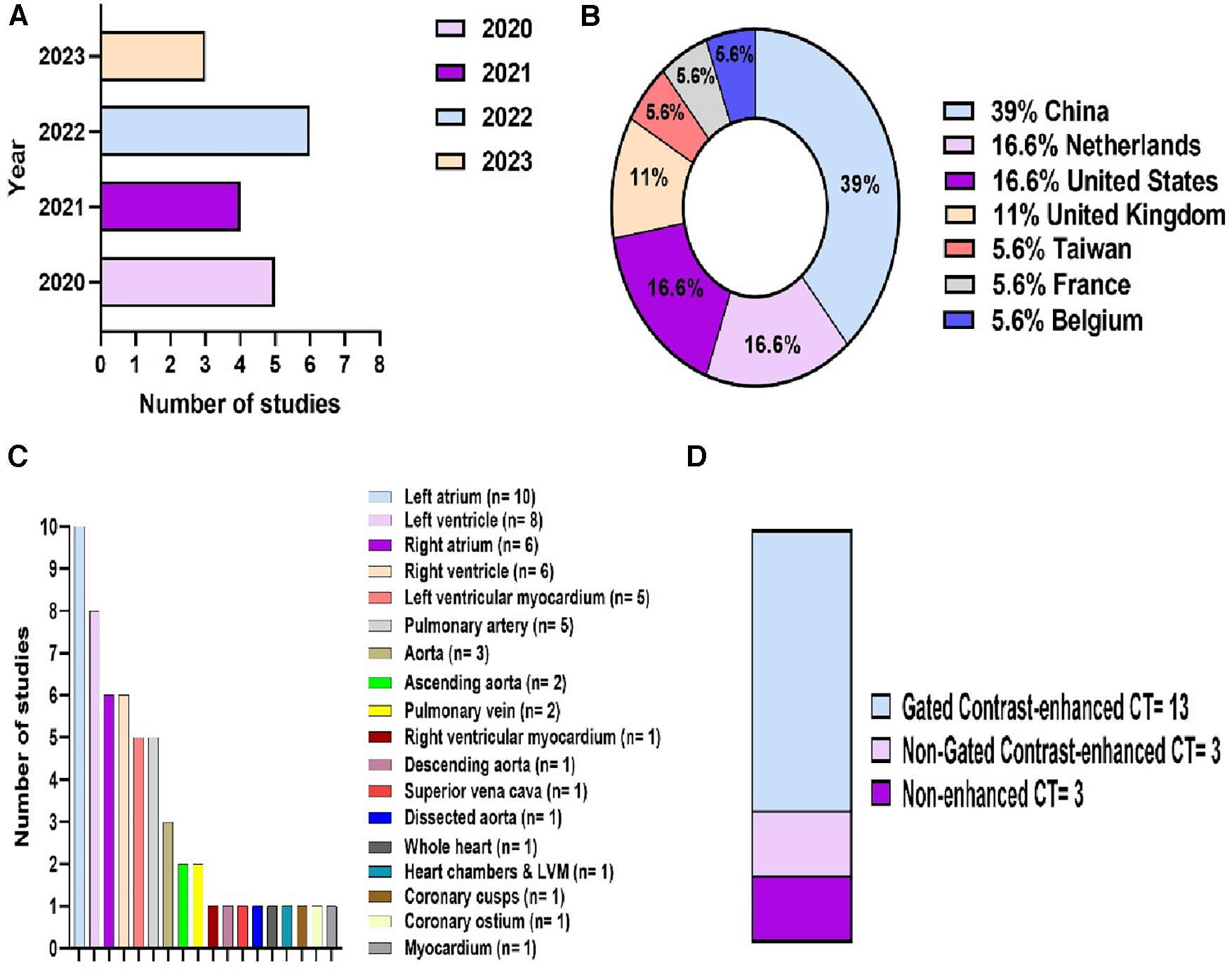 Descriptive information of the included studies. (A) Publications by year. (B) Location of the study. (C) Cardiac structures segmented. (D) CT acquisition used.