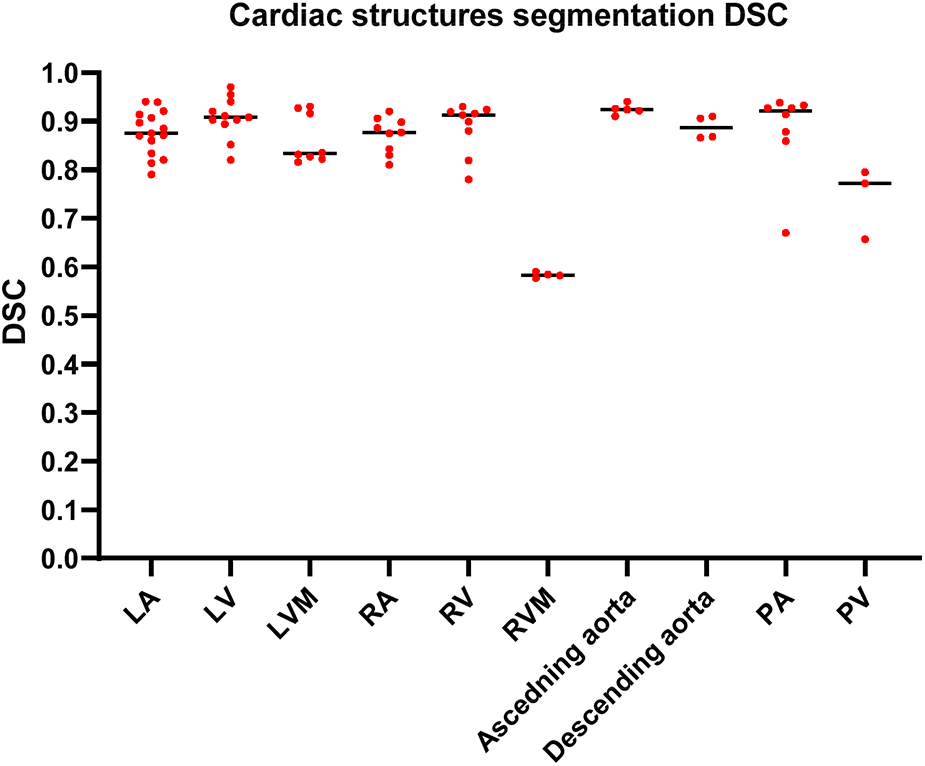 Column scatter plot showing DSC scores of different cardiac structures segmentation studies. Median DSC (solid line) is indicated.