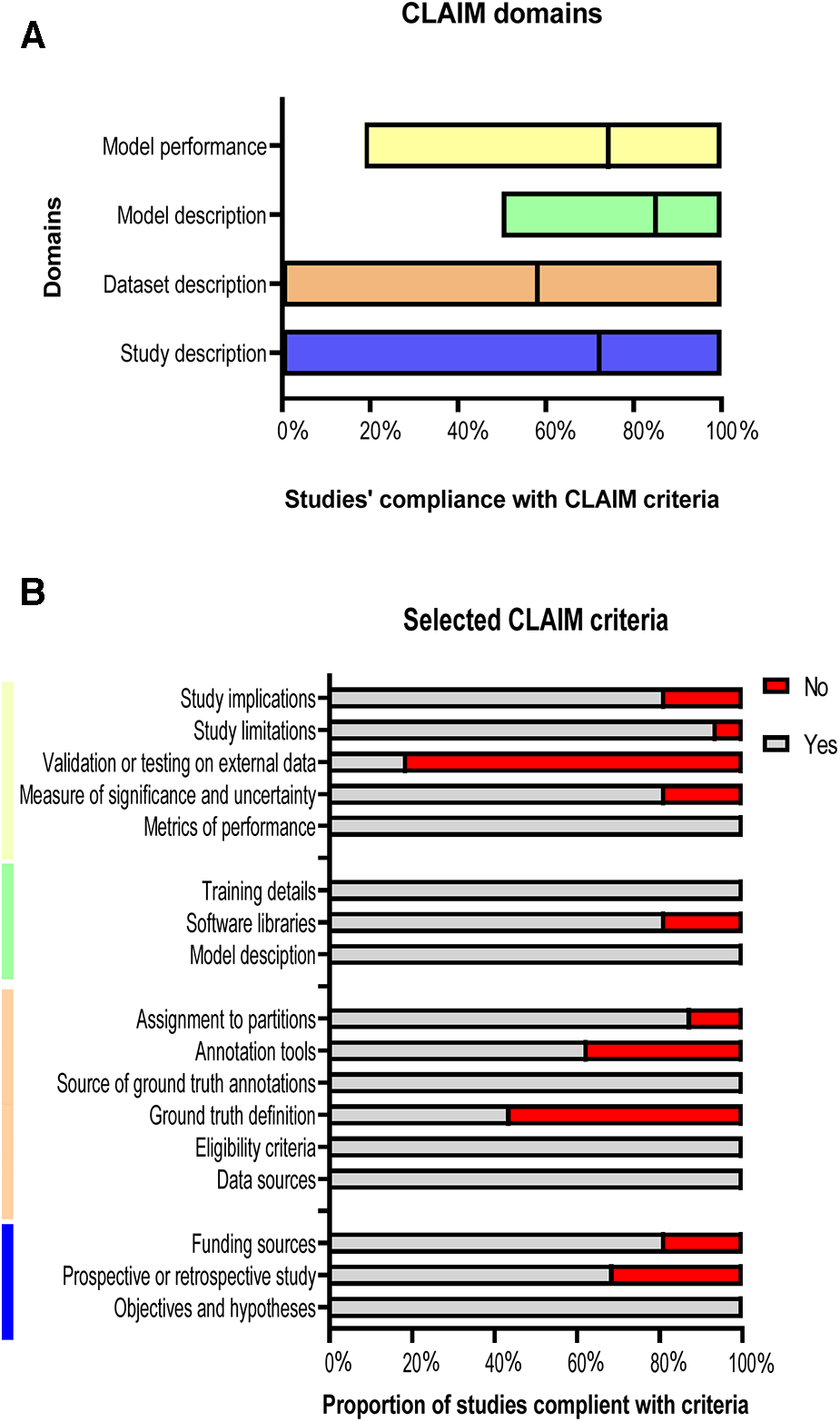 Studies’ compliance with CLAIM. (A) Floating bars present the compliance of the 18 included studies with the CLAIM, classified into four domains. The mean (solid line) is indicated. (B) Compliance of the studies with selected CLAIM criteria grouped by domains.