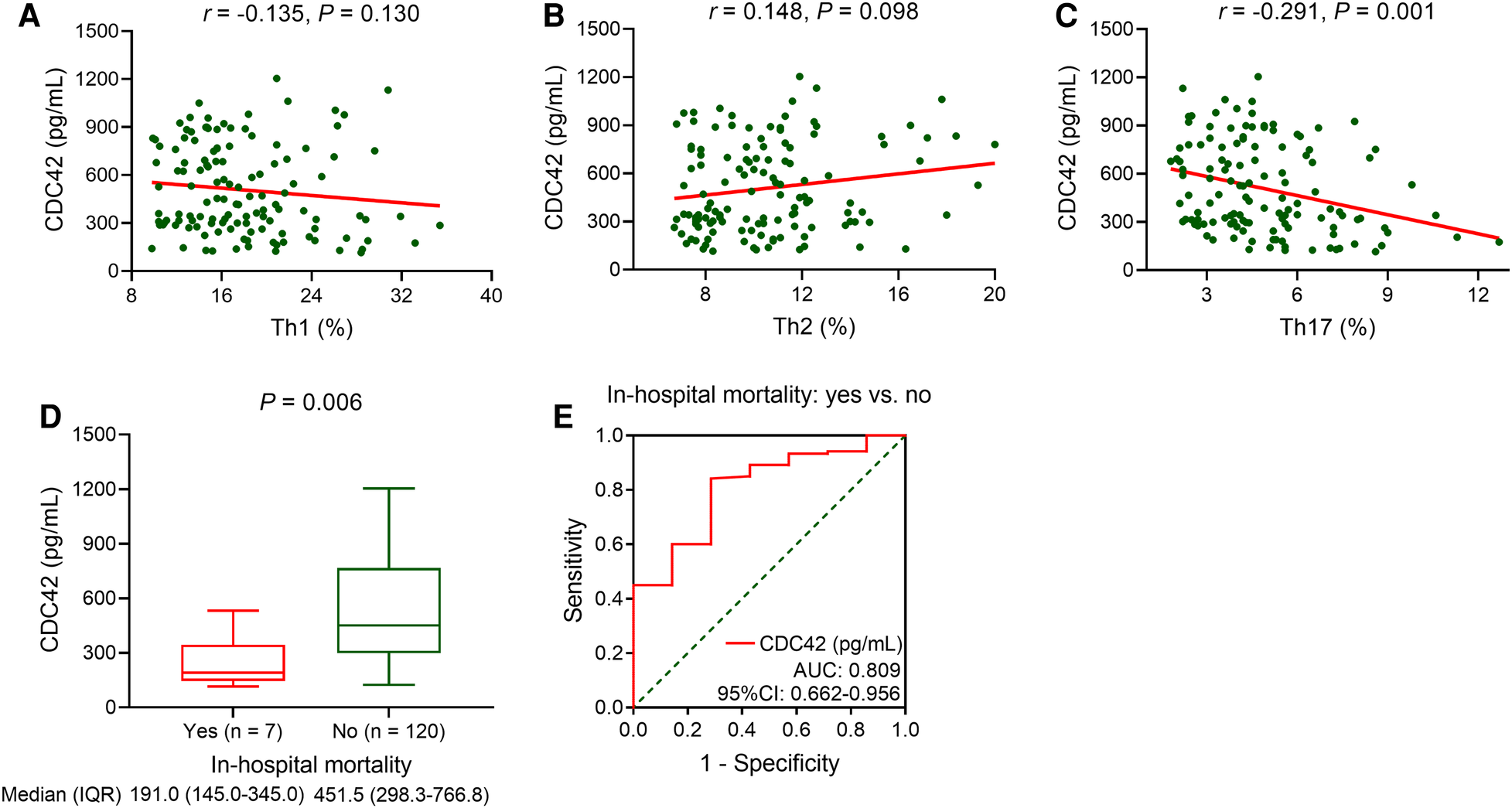 Serum CDC42 was reversely linked with Th17 cells and in-hospital mortality in TBAD patients. Linkage of serum CDC42 with Th1 (A), Th2 (B), and Th17 (C) cells in TBAD patients. Linkage of serum CDC42 with in-hospital mortality in TBAD patients (D), and its relevant ROC curve (E).