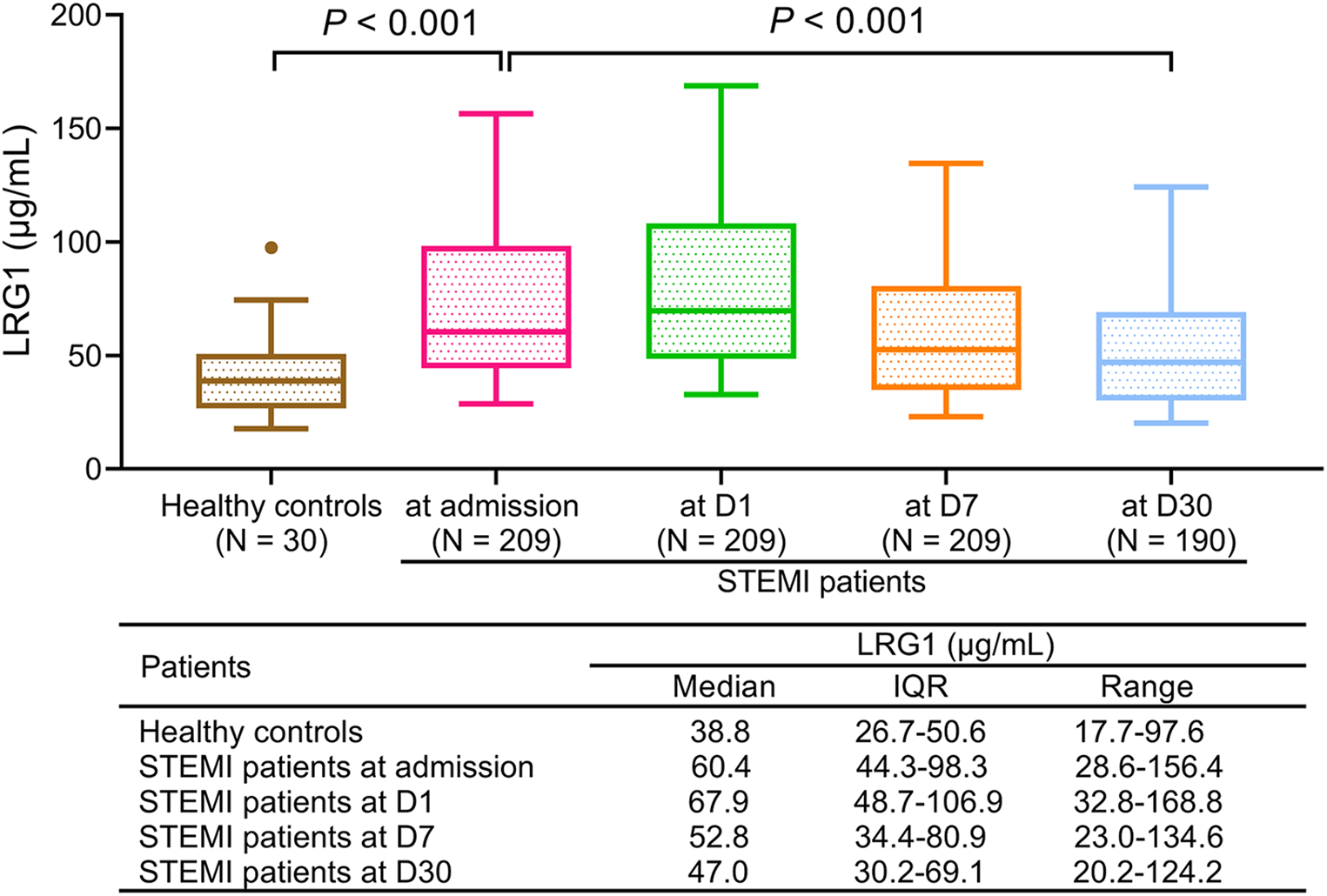 In total, 209 patients with STEMI were enrolled for determining plasma LRG1 at admission and on day (D)1/D7/D30 after admission via enzyme-linked immunosorbent assay, as well as for determination of peripheral blood T helper 17 (Th17) cells and regulatory T (Treg) cells by flow cytometry. In addition, plasma LRG1 was obtained from 30 healthy controls at enrollment.
