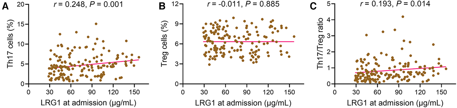 A portion of peripheral blood from patients (collected at admission, D1, D7, and D30 after admission), as well as from healthy subjects (collected after the enrollment), was centrifuged to obtain plasma, which was used to detect LRG1 by the enzyme-linked immunosorbent assay (ELISA). An ELISA kit (catalog no: E-EL-H6067; Elabscience, China) was used. Another portion of peripheral blood from the patients (collected at admission or D1 after admission) was used to detect Th17 cells and Treg cells by flow cytometry (FCM). A Th17/Treg Phenotyping Kit (catalog no: AB_2869366, BD, USA) was used.
