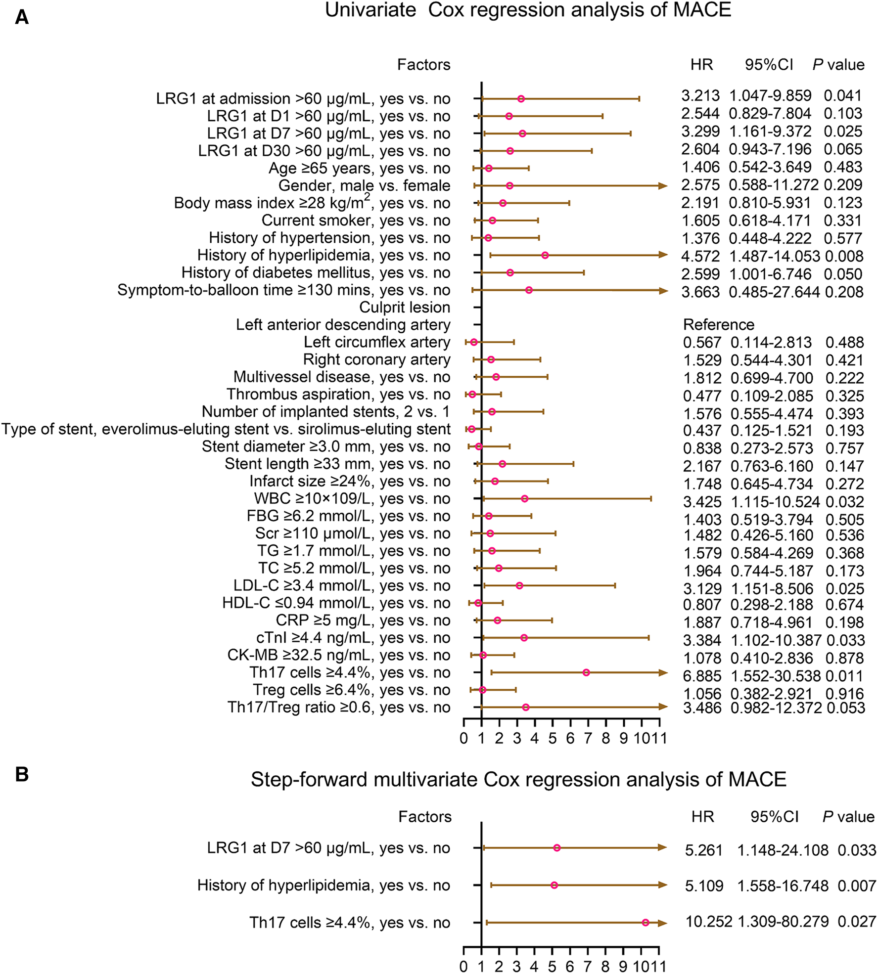 In this study, the data were analyzed using the software SPSS 25.0 (IBM Corp., USA). The patients who died within 24 h after admission were excluded from the data analysis. The Mann–Whitney U test was used for comparisons between two groups (LRG1 comparison between healthy control and patients at admission; LRG1 comparison between patients who presented with MACE and did not present with MACE at admission, D1, D7, and D30 after admission), and the Friedman test was used for comparisons among three or more matched groups (LRG1 comparison among patients at admission, D1, D7, and D30 after admission). The Spearman test was used for the correlation analysis (between LRG1 at admission and Th17, Treg cells, and Th17/Treg ratio). The receiver operating characteristic (ROC) analyses demonstrated the predictive efficacy of LRG1 at different times (at admission, D1, D7, and D30 after admission) for MACE. Kaplan–Meier (KM) curves presented the relationship between LRG1 (cut-off value was 60 μg/ml) at different times (at admission, D1, D7, and D30 after admission) and MACE. The log-rank test was the method of analysis. Univariate and step-forward multivariate Cox regression analyses demonstrated independent factors that were associated with MACE, presented by forest plot. P-values less than or equal to 0.05 were considered to indicate statistical significance.