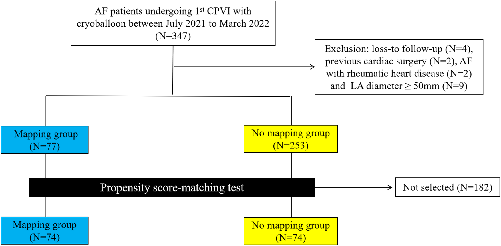 Continuous variables were expressed as means ± standard deviations or median and first to third interquartile range. Categorical variables were expressed as frequencies and percentages (%). Continuous variables were compared using Student’s t-test or the Mann–Whitney U-test. Categorical variables were compared using the χ2 test or Fisher's exact test. To reduce treatment-selection bias between the mapping group and the no-mapping group, propensity scores were calculated using binary logistic regression according to baseline characteristics and potential confounders, including age, sex, type of AF (paroxysmal, persistent, or long-standing persistent), body mass index, hypertension, diabetes mellitus, coronary artery disease, heart failure, history of stroke, drinking, smoking, B-type natriuretic peptide (BNP), LAD, and LVEF. Nearest-neighbor matching without replacement was performed on the basis of propensity scores in a 1:1 ratio with calipers of width equal to 0.2 of the standard deviation of the logit of the propensity score. The recurrence-free survival rate over follow-up was calculated using the Kaplan–Meier method and survival distributions were compared between the treatment groups by means of the log-rank test. To assess the robustness of our findings, a sensitivity analysis of the overall cohort was performed by using the multivariate Cox regression model and the univariate Cox model was used for the propensity-score-matched cohort. All covariates previously used for propensity score estimation were included in the multivariate Cox model. The P-values were two-sided, and P-values of <0.05 were deemed statistically significant. Analyses were conducted using SPSS version 26 (Armonk, NY: IBM Corp), except for propensity score matching (R version 3.5.0, The R Foundation for Statistical Computing, Vienna, Austria).
