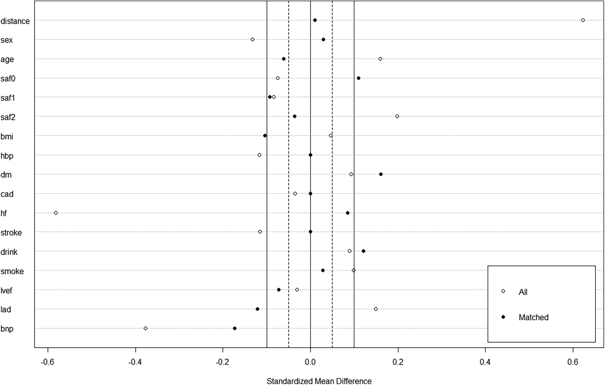 A love plot for expressing standard mean differences for baseline covariates of patients in the mapping group and no-mapping group, before and after propensity score matching.