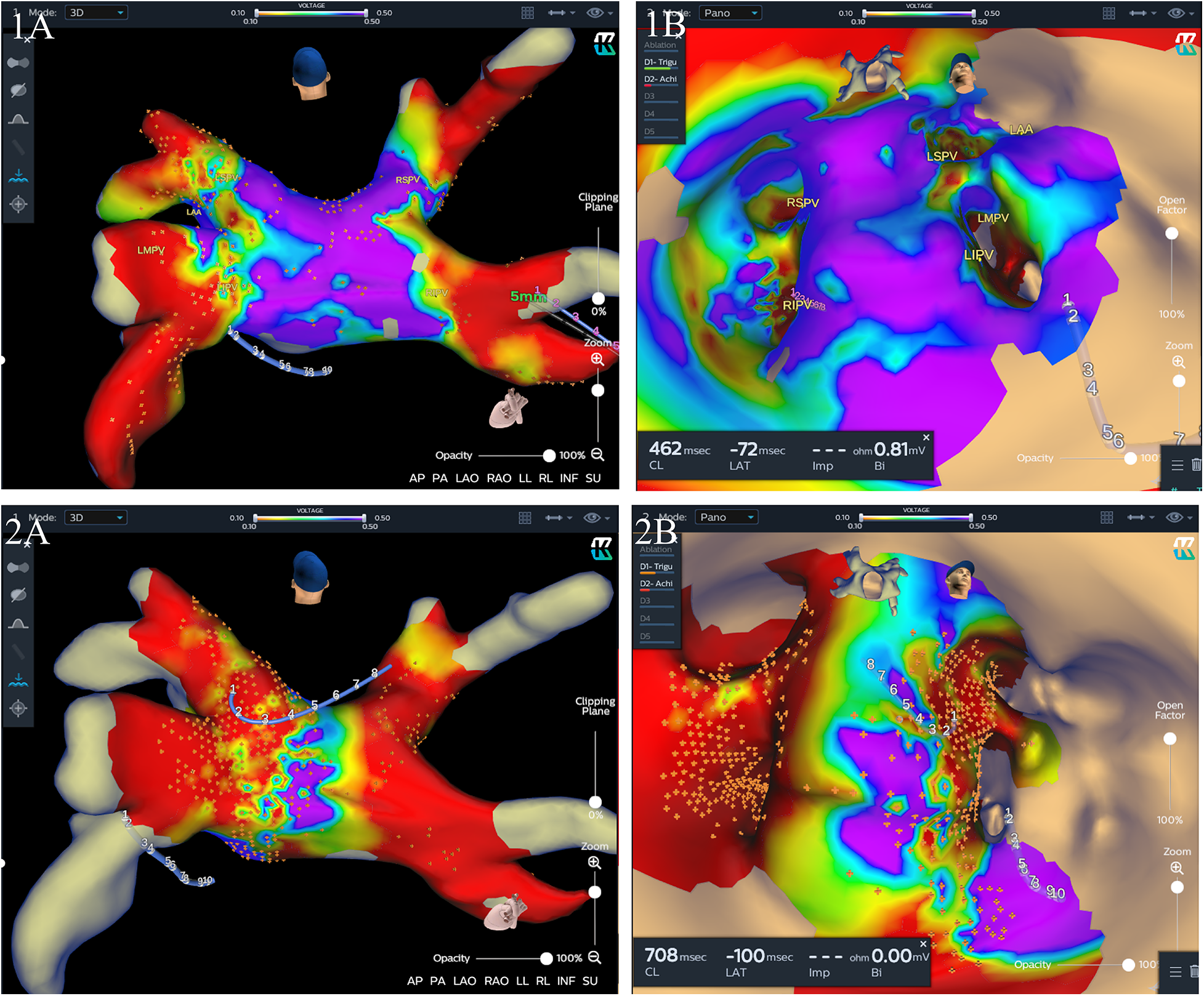 Three-dimensional (3D) electroanatomic maps (voltage cutoff: 0.1–0.5 mv) performed immediately after two freezing cycles for each PV and after additional cryoablation guided by mapping for one patient. The KODEX-EPD system offers two options for the surgeon to visualize the cardiac anatomy, a conventional shell of the heart chamber (left) and a flattened 3D panoramic view (“PANO” view) that was opened virtually across the 3D surface and offered a visualization of the endocardial surface (right). (1A and 1B) A 3D image of the left atrium in a posterior-anterior (PA) view (1A) and “PANO” view (1B) illustrating residual local signals over 0.1 mv in the RSPV and left intervenous carina region immediately after two freezing cycles for each PV. (2A and 2B) A 3D image of the left atrium in a PA view (2A) and PANO view (2B) illustrating a wide antral PVI including the carina region after additional cryoablation guided by mapping. LSPV, left superior pulmonary vein; LIPV, left inferior pulmonary vein; RSPV, right superior pulmonary vein; RIPV, right inferior pulmonary vein.