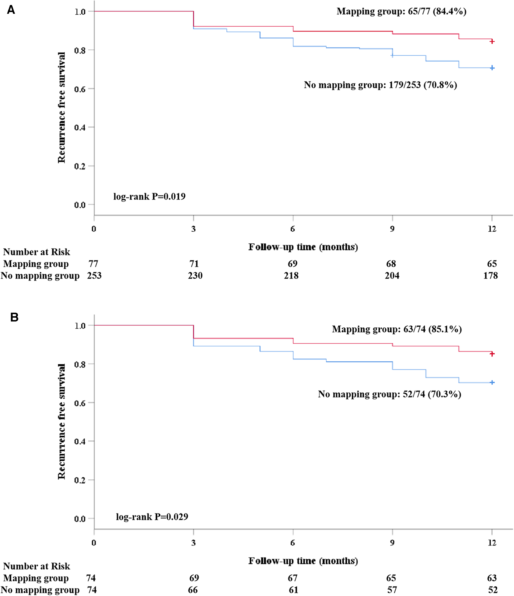 Clinical follow-up was obtained either by the scheduled 7-day Holter in 24 (16.2%) patients or by the 24-h Holter in the remaining patients. A total of 13 (17.6%) patients in the mapping group and 11 (14.9%) in the no-mapping group received 7-day Holter monitoring (P = 0.656). After a follow-up of 12 months, 33 (22.3%) patients experienced clinical recurrence. The rate of clinical recurrence identified by the 7-day Holter was similar to that of the 24-h Holter (20.8% vs. 21.8%, P = 0.918). Among five patients who were identified as having clinical recurrence by the 7-day Holter, two (40.0%) were found to be recurrence-free at the first 24 h. The Kaplan–Meier rate of freedom from clinical recurrence at 12 months in the mapping group was significantly higher than that in the no-mapping group (before matching, 84.4% vs. 70.8%, Log-rank P = 0.019, Figure 4A, after matching, 85.1% vs. 70.3%, Log-rank P = 0.029, Figure 4B). No significant differences were found between the groups with regard to AFL/AT recurrence and early recurrence within the blanking period (Table 3). Out of 9 (12.2%) patients in the mapping group and 11 (14.9%) in the no-mapping group who experienced early recurrence, 3 patients in the mapping group and 4 in the no-mapping group underwent electrical cardioversion and the others received AADs to restore their sinus rhythm. AADs (Class I or III) were suspended for all patients at the 3-month follow-up. After the blanking period, AADs (Class I or III) were prescribed less frequently because of clinical recurrence or frequent atrial premature beats both in the mapping group and in the no-mapping group (21.6% vs. 39.2%, P = 0.020).