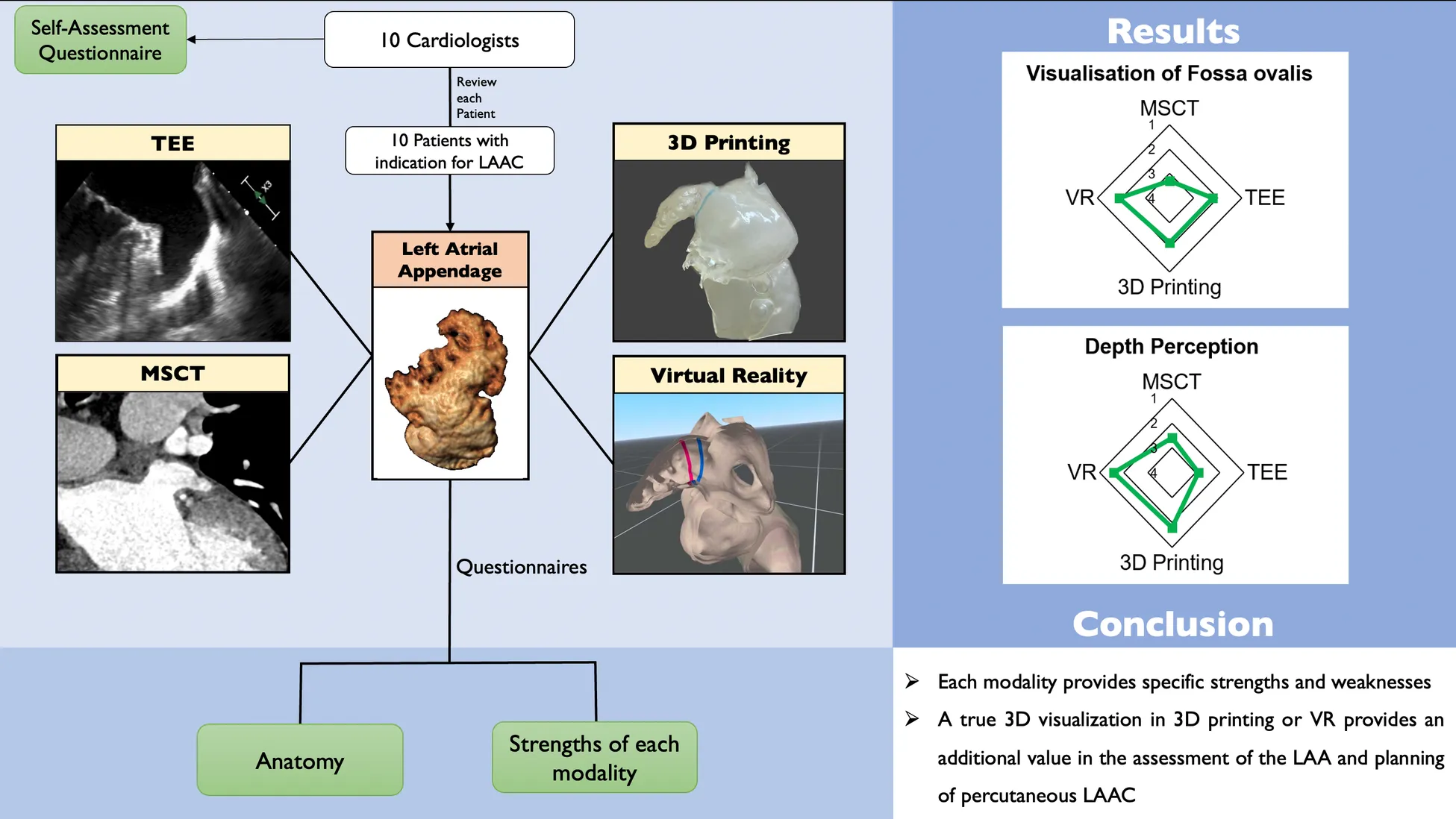 Ten patients scheduled for interventional LAA closure were evaluated with MSCT and TEE. Patient-specific 3D printings and VR models were fabricated based on MSCT data. Ten cardiologists then comparatively assessed LAA anatomy and its procedure relevant surrounding structures with all four imaging modalities and rated their procedural utility on a 5-point Likert scale questionnaire (from 1 = strongly agree to 5 = strongly disagree).