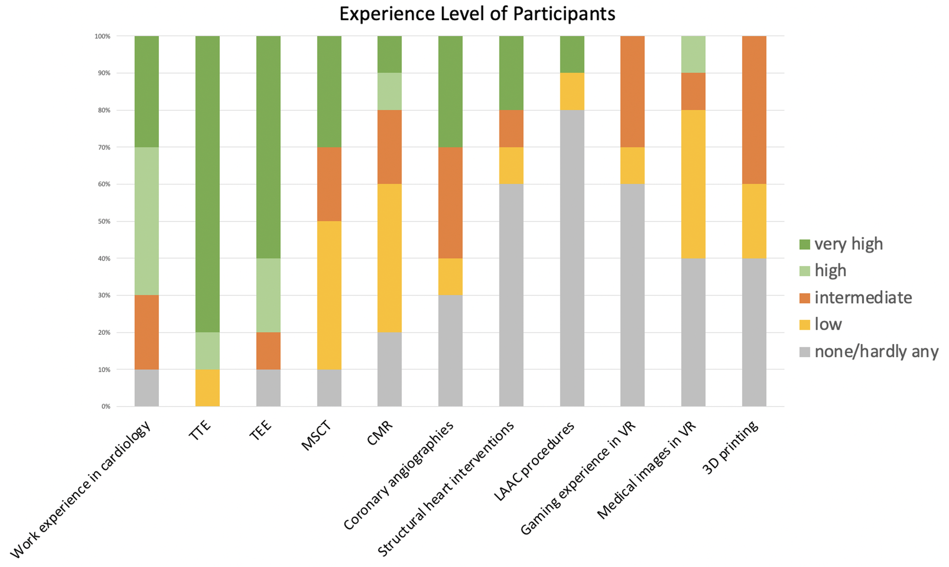 Clinical experience of participants. Overview of the clinical experience of participating cardiologists. Participants had varying degrees of experience in cardiology in general, but also in interventional cardiology and cardiovascular imaging. Most participants had little or no experience in VR or 3D printing. VR, virtual reality; TTE, transthoracic echocardiography; TEE, transesophageal echocardiography; MSCT, multi-slice computed tomography; CMR, cardiovascular magnetic resonance; LAAC, left atrial appendage closure.