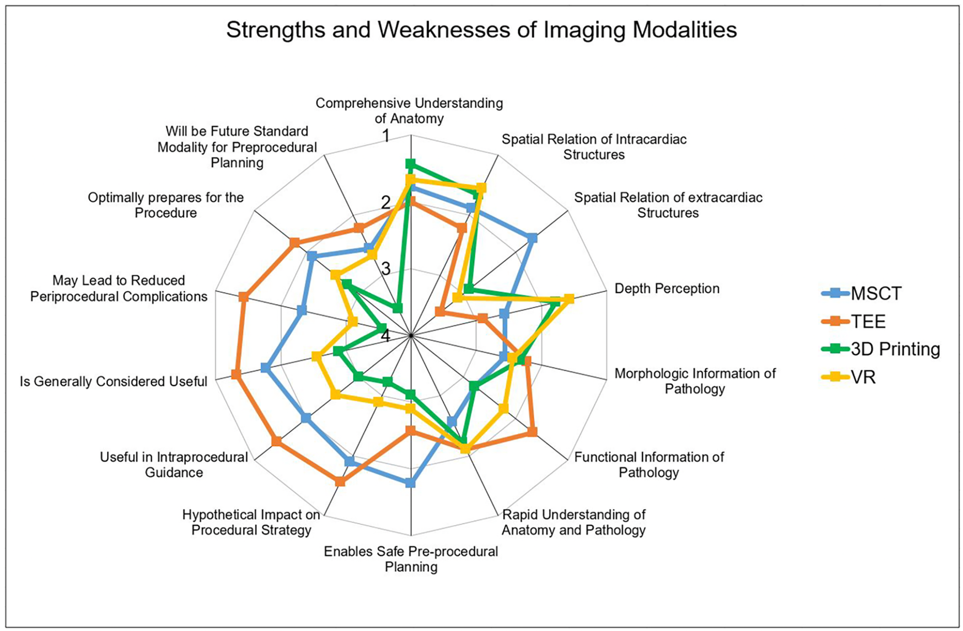 As this was a retrospective study, the influence of the different modalities on procedural steps were not directly investigated. However, to address this point, several questions regarding the hypothetical impact on the procedure were implemented. It could be shown, that all modalities offer comparable morphologic information. However, TEE best displayed functional information such as myocardial or valvular function compared to other modalities. Furthermore, participants rated MSCT the highest in the capability to enable safe procedure planning. Additionally, TEE was rated most useful for intraprocedural guidance, while the benefit of VR and 3D printing in this regard was rated low. Finally, participants rated the hypothetical impact on the procedural strategy. Here, MSCT and VR were rated higher compared to VR and 3D printing. Detailed performances of the modalities are displayed in Figures 2, 3.