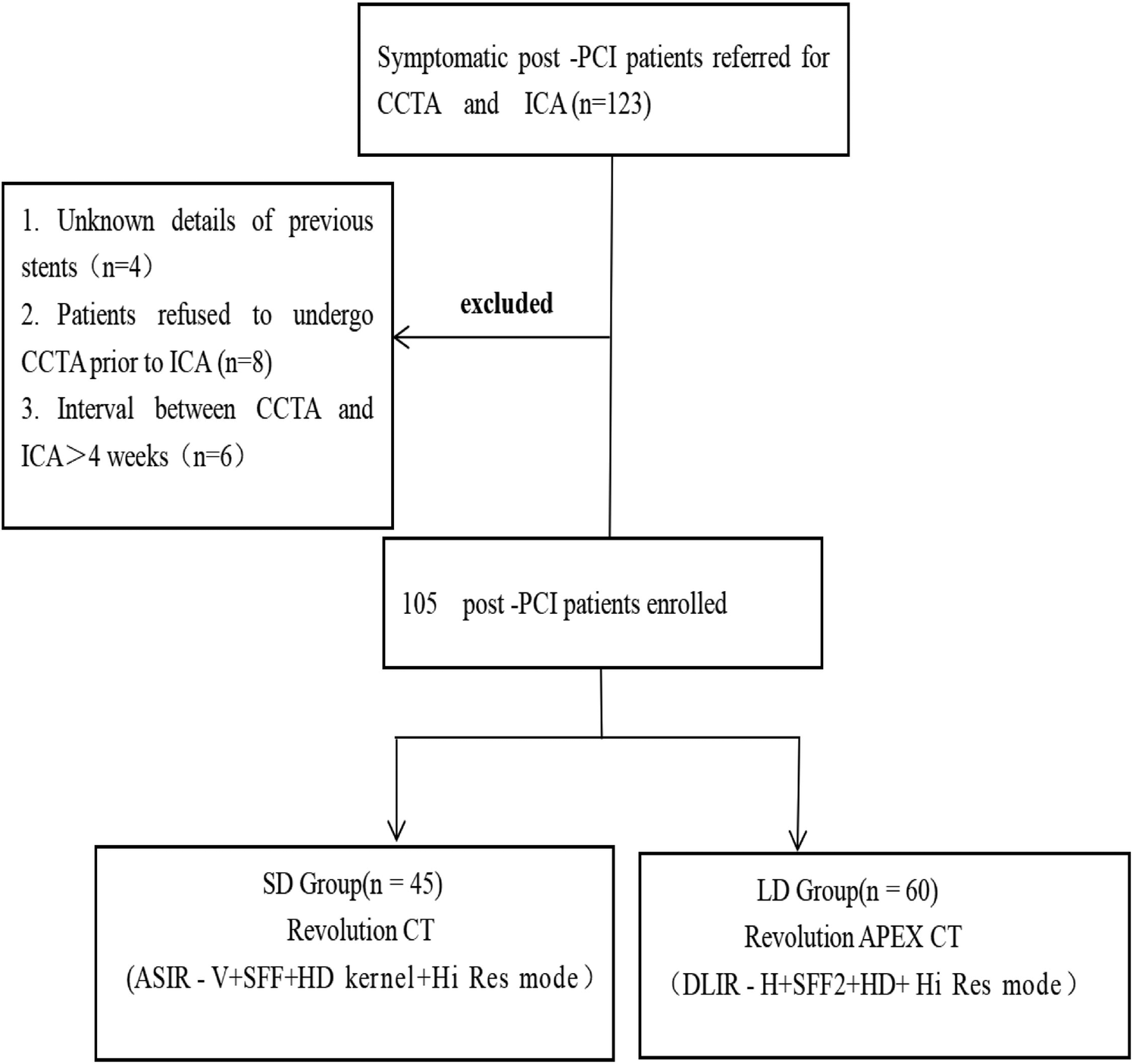 This prospective study was approved by the ethics committee of our hospital, and all patients provided informed consent. A total of 123 patients who had undergone PCI with drug-eluting stents and who were scheduled for CCTA (randomly underwent low-dose CCTA or standard-dose CCTA) and invasive coronary angiography (ICA) from January 2022 to July 2022 were prospectively enrolled (Figure 1). The inclusion criteria included patients with prior PCI and implantation of a drug-eluting stent and those undergoing CCTA and ICA for suspected in-stent restenosis. The exclusion criteria included the following: (a) iodine contrast agent allergy; severe liver and kidney insufficiency; (b) decompensated cardiac insufficiency; (c) absence of ICA examinations or a CCTA and ICA interval longer than 1 month; and (e) patients with stent-in-stent or missing stent records (14). Finally, 105 patients were included in the study and were divided into the low-dose group (LD group) and standard-dose group (SD group) according to the CCTA protocols.
