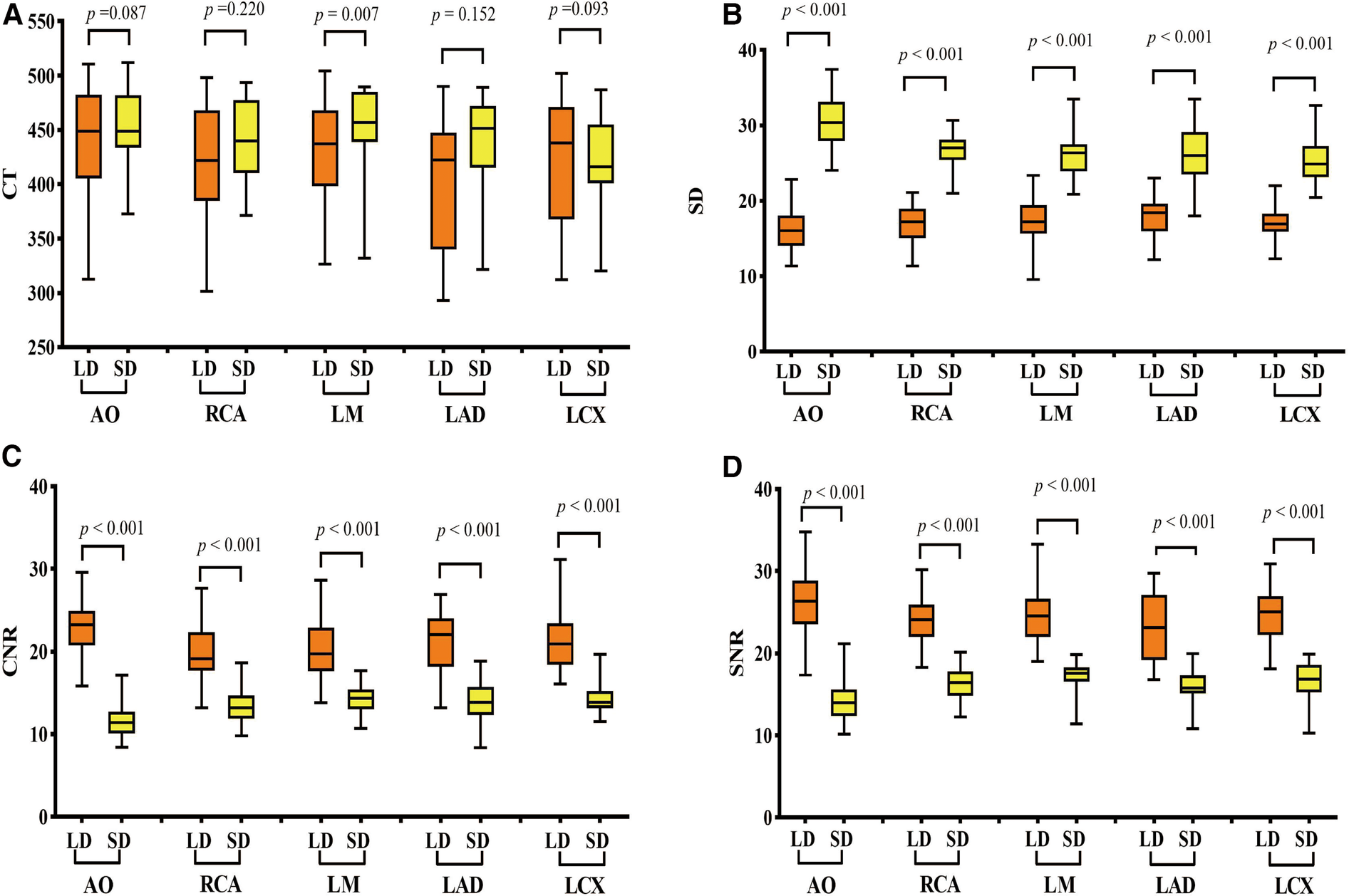 Comparison of objective image quality scores of vessels between the two groups. (A) CT values, (B) image noise values, (C) SNR values, and (D) CNR value comparison between the LD and HD groups. LD stands for low-dose group and HD stands for high-definition group. SNR, signal-to-noise ratio; CNR, contrast-to-noise ratio; AO, aortic root; RCA, right coronary artery; LMA, left main artery; LAD, left anterior descending branch; LCX, left circumflex branch. p < 0.001 was a significant difference.