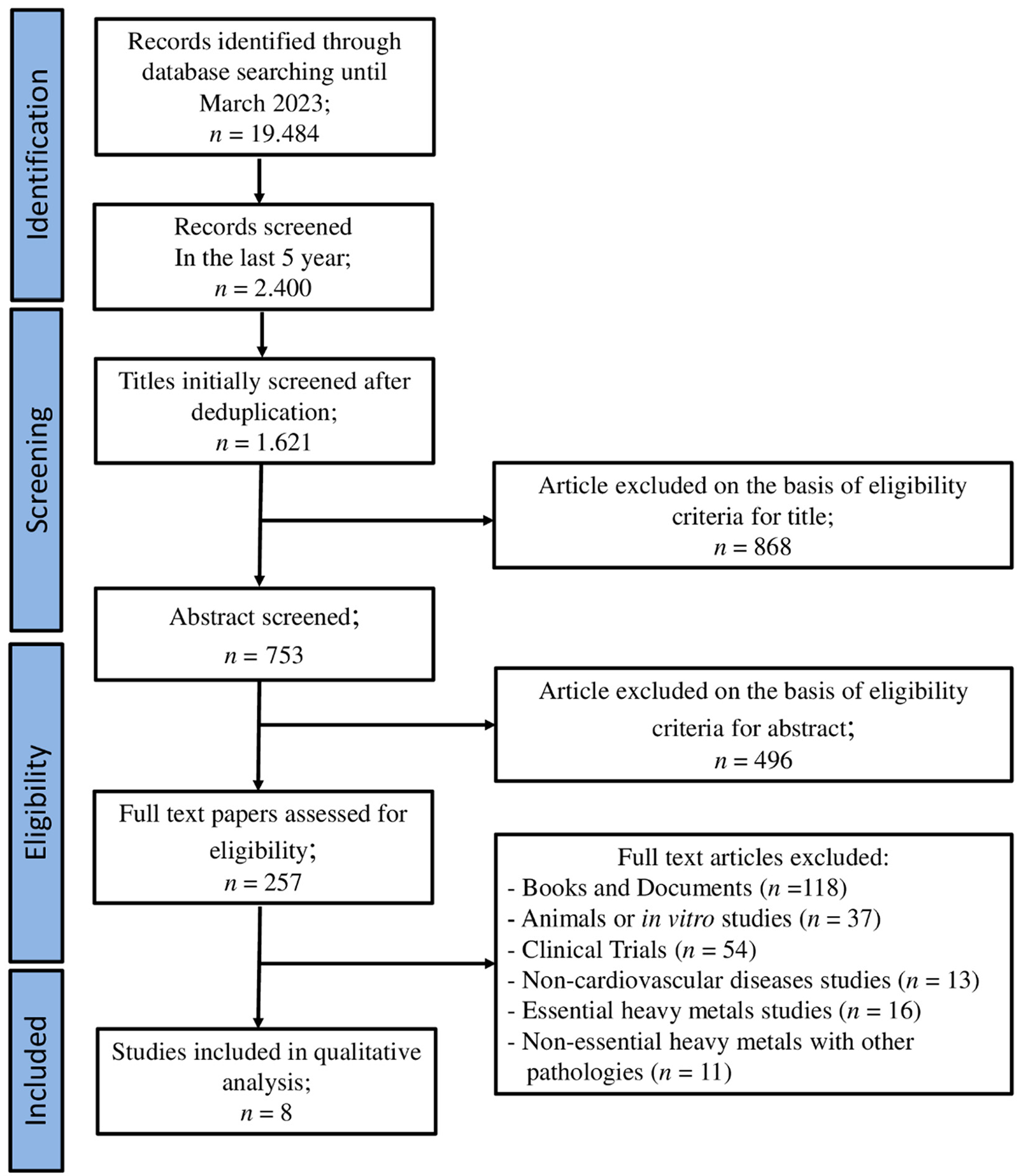 This mixed-studies/mixed-methods review includes published data from experimental studies concerning the link between heavy metals and CVDs and, in particular, the role played by non-essential metals in humans. The keywords used to search for articles were “metals and cardiovascular risks”, “metals and cardiovascular diseases”, “heavy metals and cardiovascular risks”, “heavy metals and cardiovascular diseases”, “non-essential heavy metals and cardiovascular risks”, “non-essential heavy metals and cardiovascular diseases”, “non-essential heavy metals and hypertension”, “non-essential heavy metals and atherosclerosis”, and “non-essential heavy metals and myocardial infarction”. The studies included in the review were retrieved from PubMed, Medline, Embase, and Web of Science databases, in accordance with the PRISMA (Preferred Reporting Items for Systematic Reviews and Meta-Analyses) statement and following the PICO (Population Intervention Comparison Outcome Population) framework. The reference list of all retrieved articles was also reviewed to identify other eligible studies that were not indexed by the afore mentioned databases. All papers written in English and published in the period from 1945 to 2023 were evaluated. For the qualitative analysis of the systematic review, only articles from the last 5 years were considered. The reference list of all retrieved articles was also reviewed to identify other eligible studies that were not indexed by the aforementioned databases.