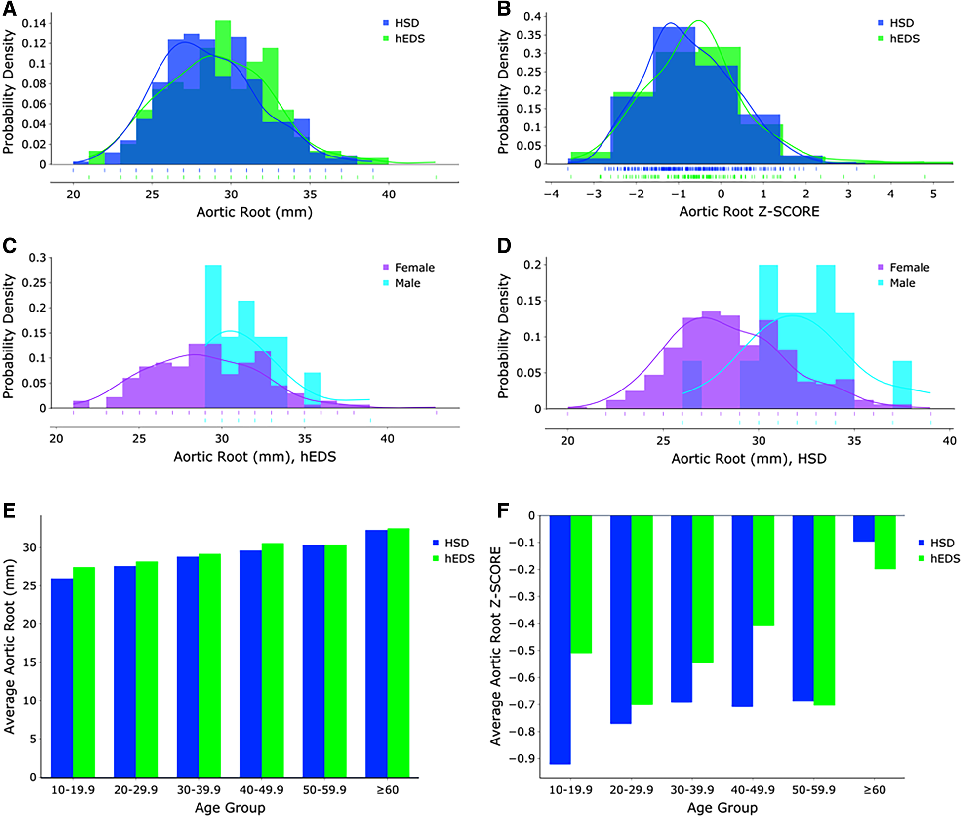 The prevalence of aortic root dilation in patients with hEDS was 2.7% and for HSD was 0.6%, with larger measurements for males than females and with age. Based on self-reported cardiac history that was verified from the medical record, patients with hEDS with bradycardia (p = 0.034) or brain aneurysm (p = 0.015) had a significantly larger average adult aortic root z-score. In contrast, patients with HSD that self-reported dysautonomia (p = 0.019) had a significantly larger average aortic root z-score. The prevalence of diagnosed mitral valve prolapse in patients with hEDS was 3.5% and HSD was 1.8%. Variants of uncertain significance were identified in 16 of 84 patients that received genetic testing based on family history.