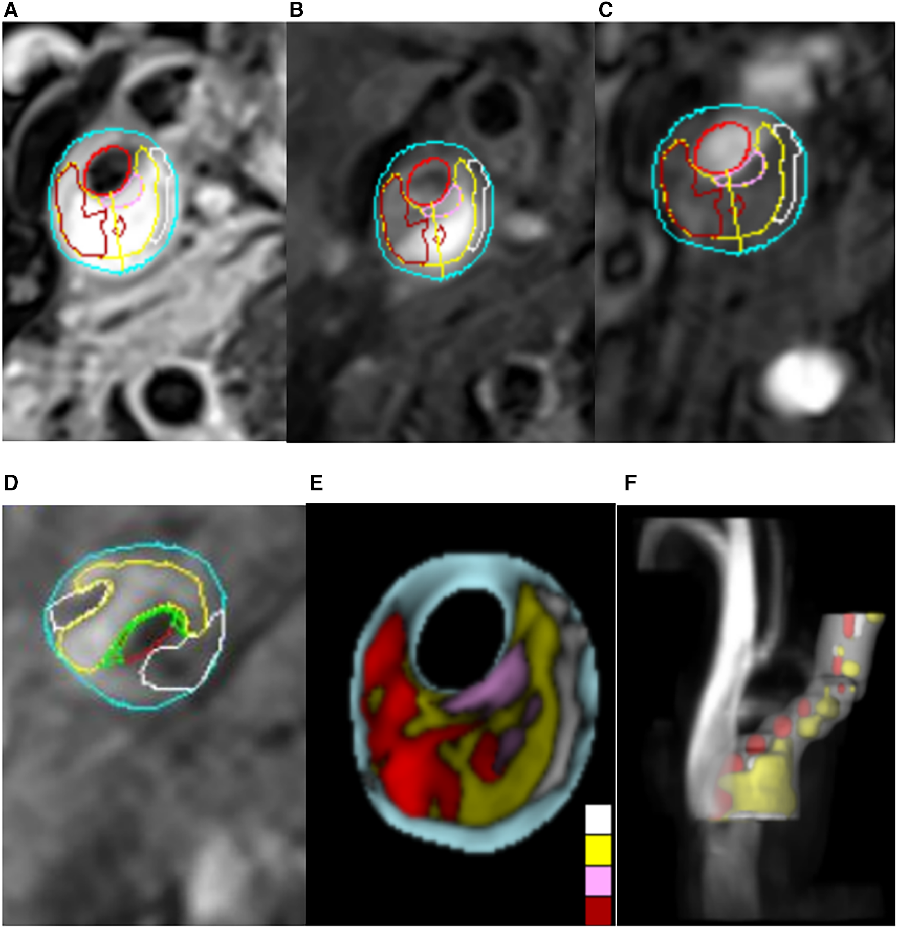 Carotid MRI semi-automatic segmentation of plaque composition. (A–D) The MRI-PlqueView vascular plaque imaging Diagnostic System was used to delineate the plaque component regions on T1-weighted imaging (T1WI), T2-weighted imaging (T2WI) and time-of-flight (TOF) sequences. Different colors indicated different plaque components. Yellow represents lipids, white represents calcification, green represents fibrous caps, dark red represents intraplastic hemorrhage, positive red represents lumen, and blue represents wall. (E,F) The MRI-PlaqueView vascular plaque imaging Diagnostic System was used to automatically recompose the cross section and 3D blood vessel images.