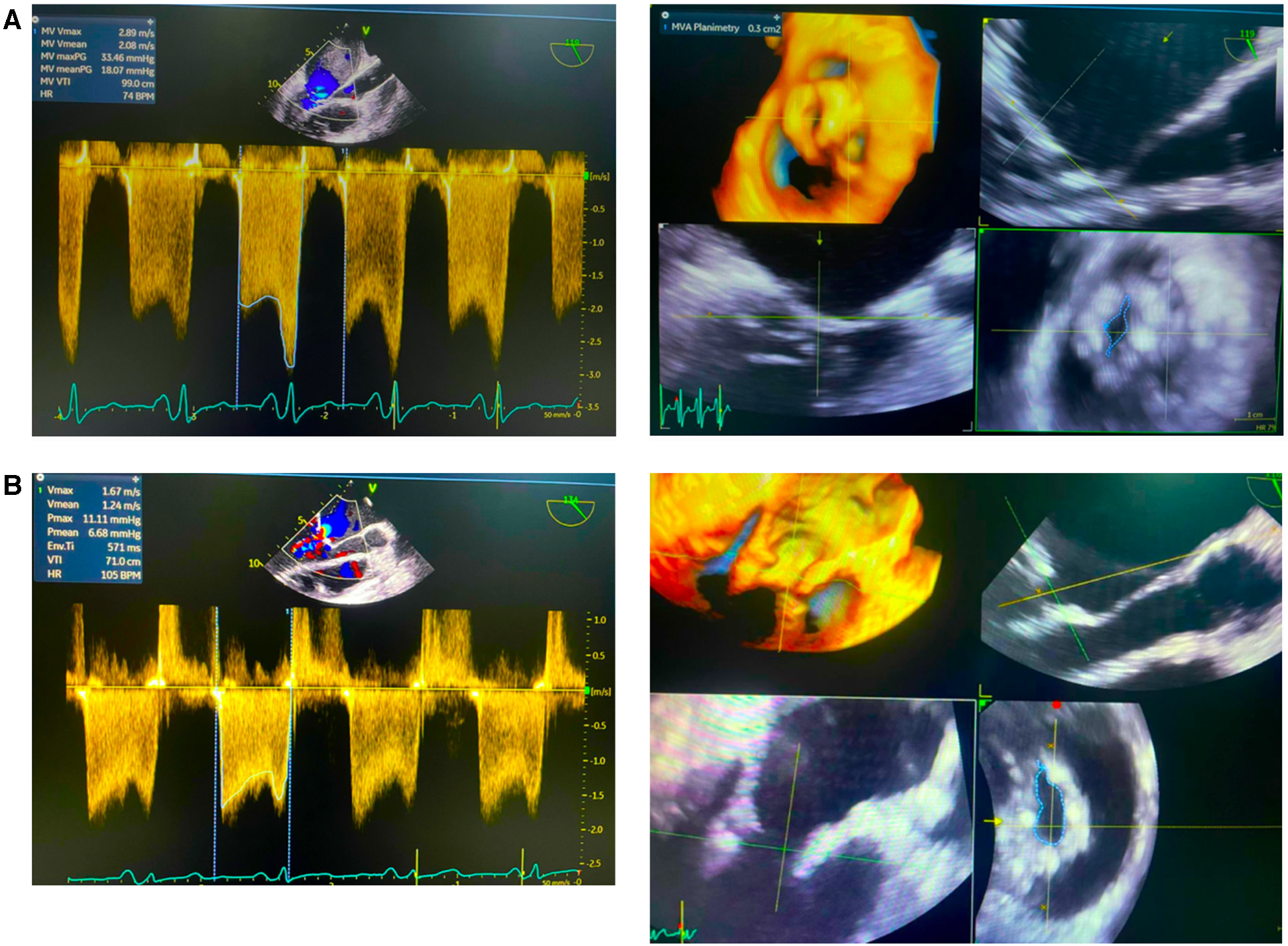 Echocardiography pre- and post- percutaneous balloon mitral valvotomy (PBMV). (A) Initial data showed mean valve area (MVA) plannimetry was 0.3 cm and mean valve gradient (MVG) 18.7 mmHg. (B) Post PBMV showed mean valve area (MVA) plannimetry was 1.0 cm and mean valve gradient (MVG) 6.68 mmHg.
