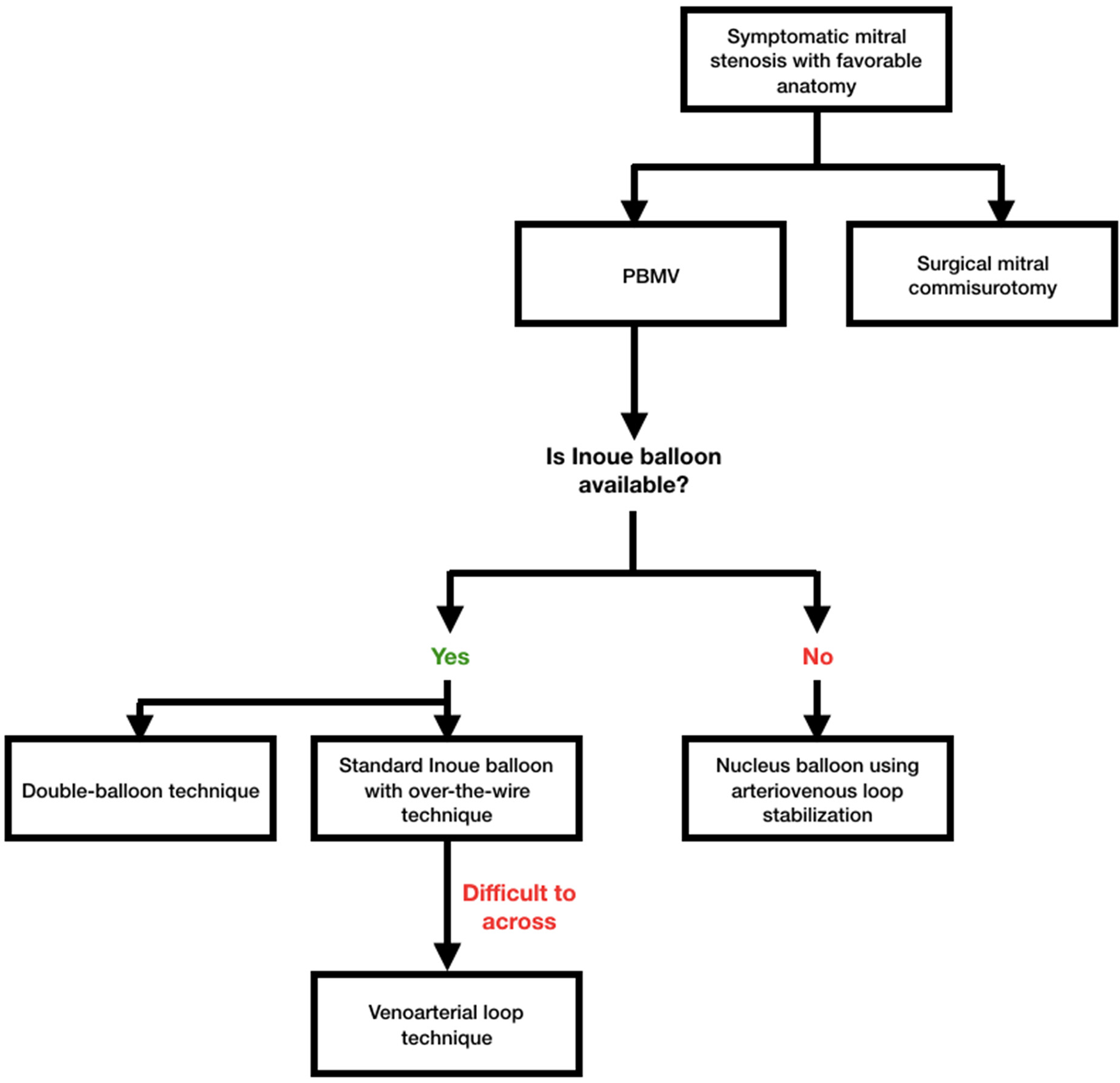 Proposed algorithm for percutaneous baloon mitral valvotomy (PBMV) in symptomatic mitral stenosis patients with favorable anatomy. Standard Inoue balloon with over-the-wire technique should be the default option in settings where Inoue balloon is offered. The venoarterial loop approach could be employed for stabilization if the wire is challenging to get through. Nucleus balloon employing arteriovenous loop stabilization may become an option when Inoue balloon is not a viable choice. The usual single Inoue balloon technique is preferable because the double-balloon procedure had a higher rate of complications with comparable outcomes.