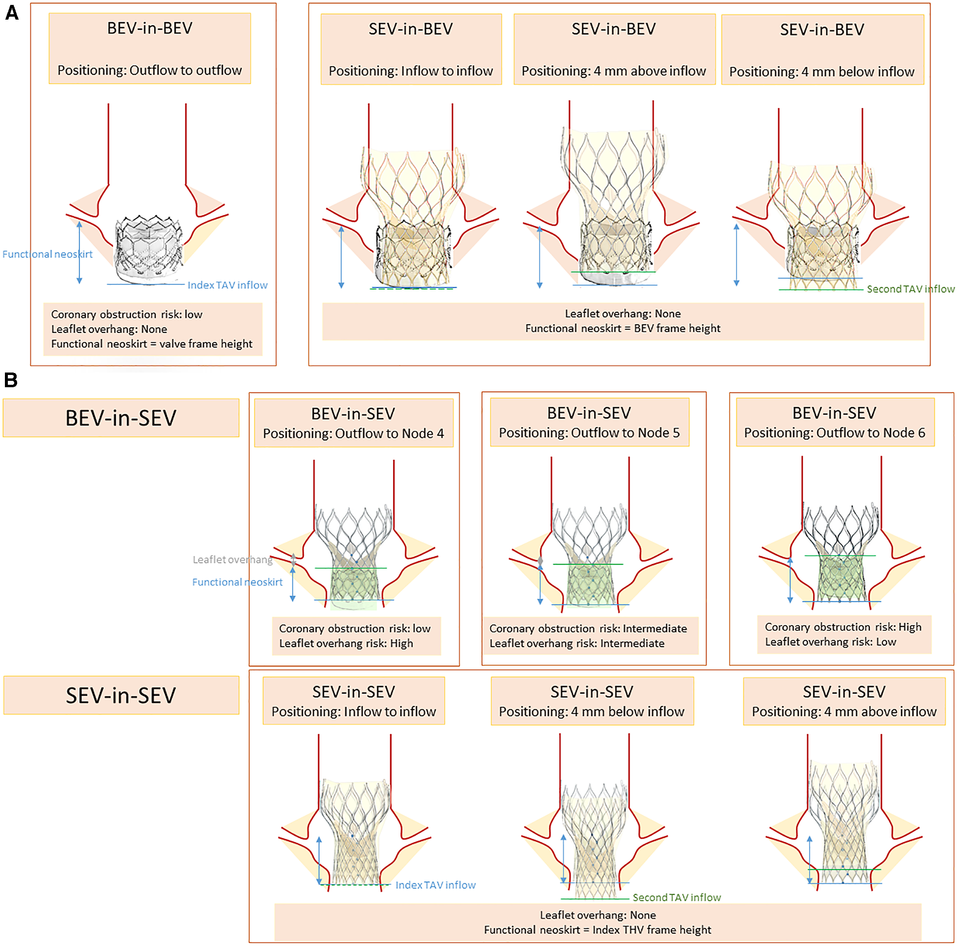 Positioning scenarios and considerations in TAV-in-TAV (A) Sapien index THV (B) Corevalve index THV.