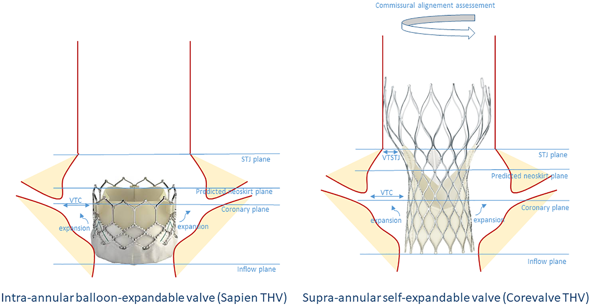 Schematic representation of the criteria to determine the risk of coronary flow compromise before TAV-in-TAV in an index Sapien or Corevalve THV. STJ, sino-tubular junction; VTC, valve to coronary; VTSTJ, valve to sino-tubular junction.