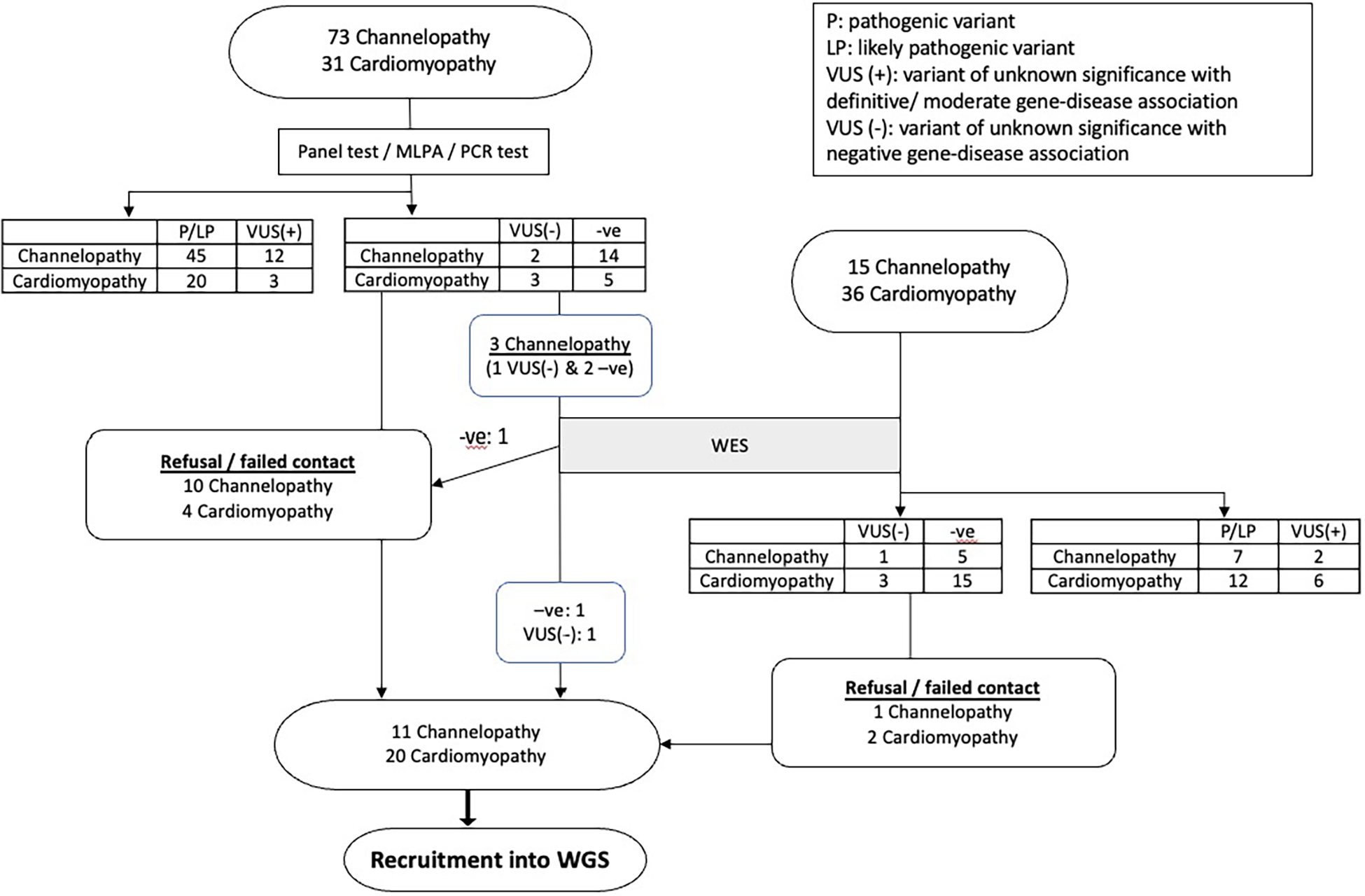 Among the remaining patients, 3 channelopathy and 6 cardiomyopathy patients had VUS with no gene-disease association, while 19 channelopathy patients and 20 cardiomyopathy patients had no variants identified in initial genetic testing. Figure 1 showed the detailed flow chart of our study recruitment.
