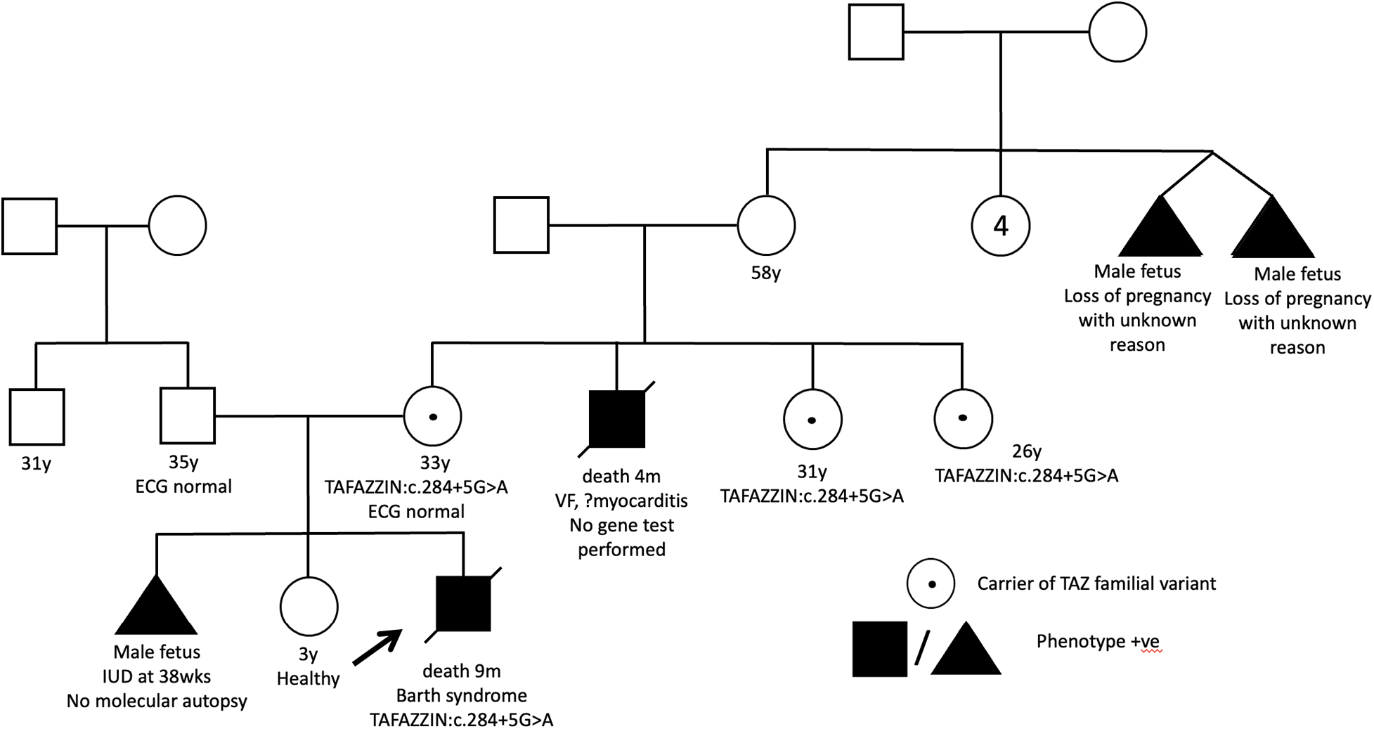 A full-term male infant with a birth weight of 2.4 kg was born. The antenatal morphology scan revealed cardiomegaly and pericardial effusion. He had a strong family history of intrauterine and early infant death among male family members (Figure 2). At 2 weeks of age, he developed cardiogenic shock. Echocardiography confirmed the diagnosis of DCM with global left ventricular dysfunction. Additionally, he experienced neonatal ketotic hypoglycemia, evolving generalized hypotonia and gross motor delay. Initial metabolic investigations, including urine methylglutaric acid, were unremarkable. Genetic testing using WES only identified a variant in the SCN5A gene (SCN5A: c.874G>A, p.Gly292Ser) but the variant frequency in the East Asian population (8/19536, f = 0.0004095, GnomAD) was too high to be considered significant for reporting. There were no other supporting in-silico or functional data to indicate its pathogenicity. No other variants of interest could be identified. Unfortunately, the patient succumbed to refractory heart failure at 9 months of age, and neutropenia was also observed.