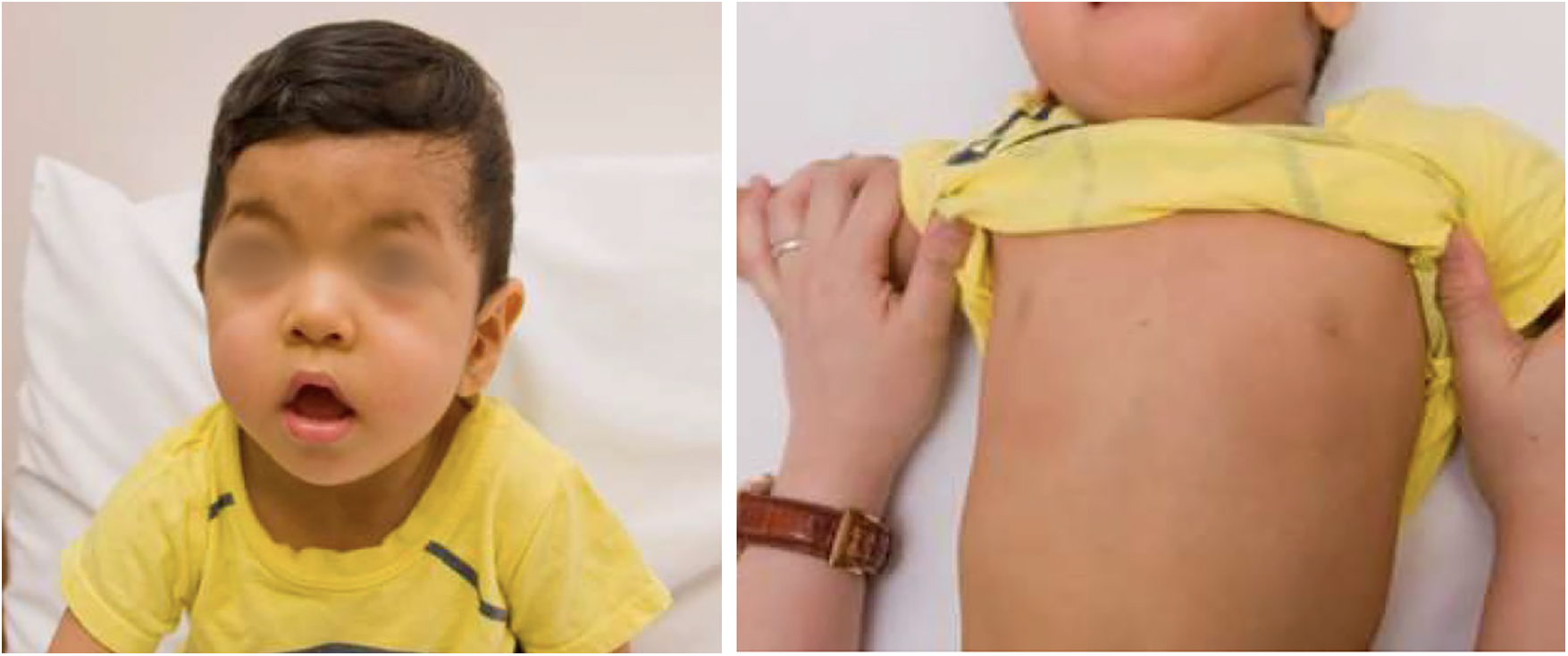The patient presented with antenatal ventricular hypertrophy, with subsequent established postnatal diagnosis of HCM, secundum atrial septal defect and left coronary artery fistula to right ventricle. There was symmetrical hypertrophy of his myocardium, which was compatible with HCM changes related to RASopathy. In addition, he also had Abernethy malformation type 1b, with congenital absence of portal vein. Clinical examination revealed facial features consistent with Noonan syndrome (Figure 4), along with developmental delay. Prior genetic testing utilizing trio WES was negative. There was no significant family history.