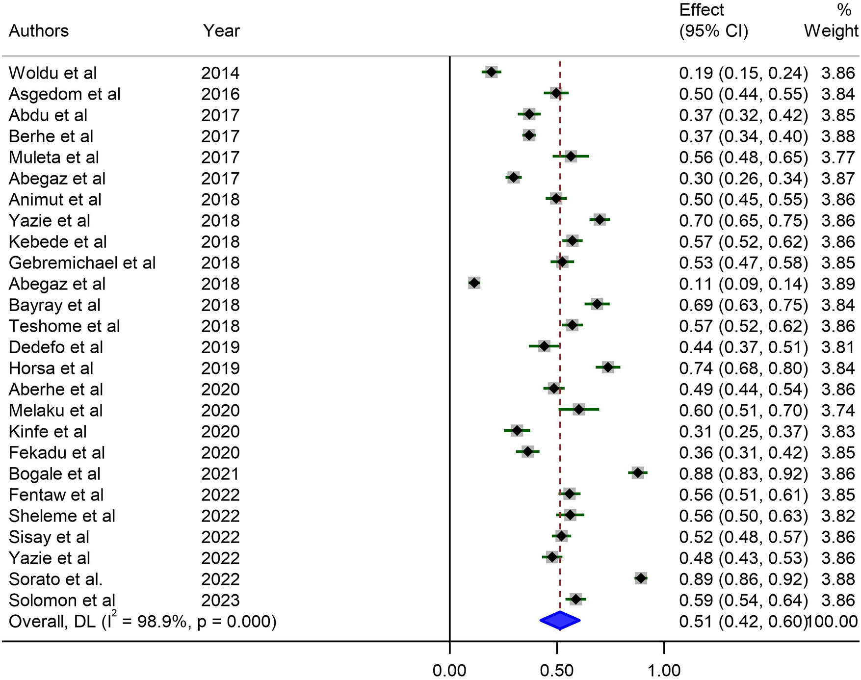 The estimated proportion of uncontrolled HTN in Ethiopia from the included 26 studies was 51% [95% confidence interval (CI), 42%–60%]. A weighted inverse variance random-effects model was used, and high degree of heterogeneity was identified between studies, as verified by the I2 statistics (I2 = 98.9%, P < 0.001) (Figure 2).
