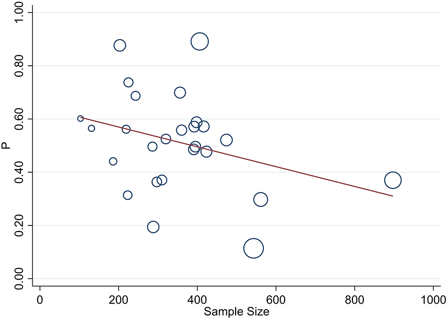 Univariate meta-regression of the prevalence of uncontrolled hypertension and sample size for analyzing heterogeneity between studies. Each circle represents a study, with the area of each circle proportional to that study's weight in the analysis. The meta-regression line is overlaid on the scatterplot, with its slope indicating the magnitude and direction of the association.