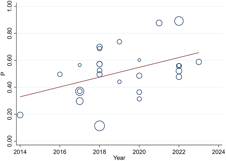 Univariate meta-regression of the prevalence of uncontrolled hypertension and year of publication for analyzing heterogeneity between studies. Each circle represents a study, with the area of each circle proportional to that study's weight in the analysis. The meta-regression line is overlaid on the scatterplot, with its slope indicating the magnitude and direction of the association.