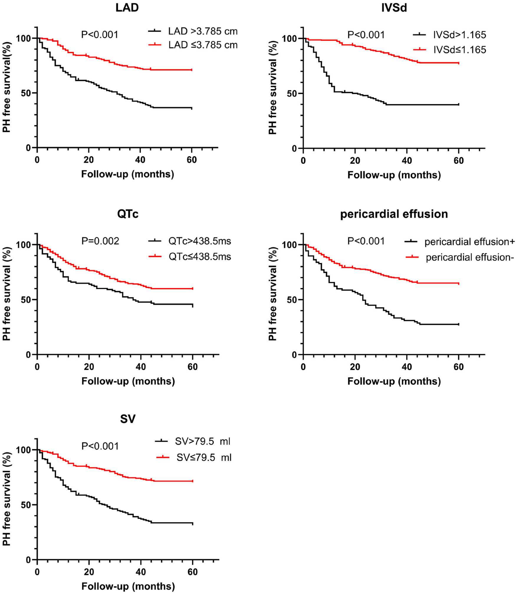 The echocardiographic LAD, LVDd, IVSd, SV, and LVPW of patients with new-onset PH were significantly higher than those without PH. Furthermore, the probability of pericardial effusion and left ventricular hypertrophy was significantly higher in those with new-onset PH than in those without PH. However, the AO, ratio of early-to-late diastolic filling peak-flow velocities (E/A ratio), or the reduction of left ventricular compliance did not affect the incidence of new-onset PH. (Table 3).