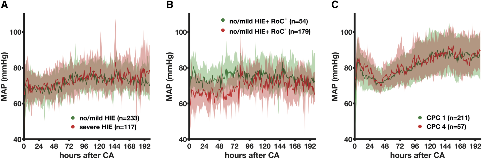 Accordingly, compared to non-survivors, CPC 1 and CPC 4 survivors had higher MAP values without critical MAP drops. Hypotension during the dying process may explain the MAP differences between our non-survivor and survivor cohorts. CPC 4 survivors had significantly higher MAP values compared to CPC 1 survivors, but except for the first 24 h, the differences were not larger than 2 mmHg. Due to clinically proven severe HIE, the CPC 4 survivors enabled us to study—unbiased by death—the association between MAP and brain injury.